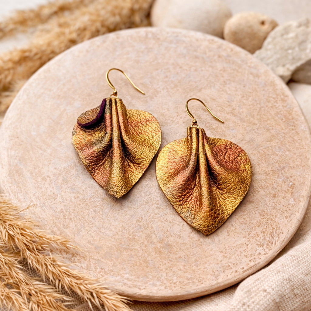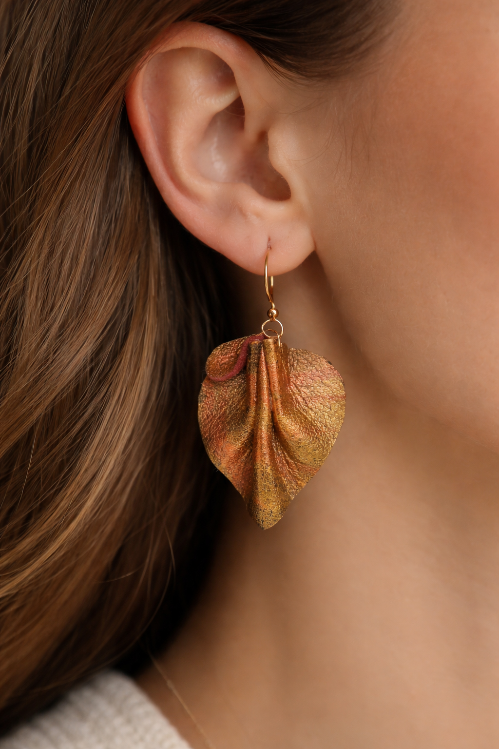 Lumme korvakoru aitoa nahkaa! Käsinmaalattu kulta/kupari hohde. Pituus  koukun kanssa 5.5cm.