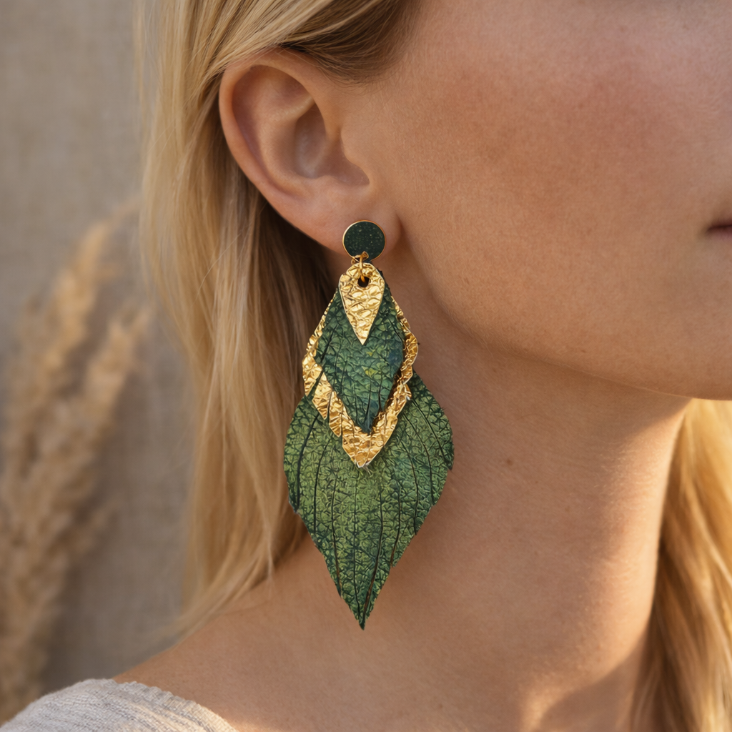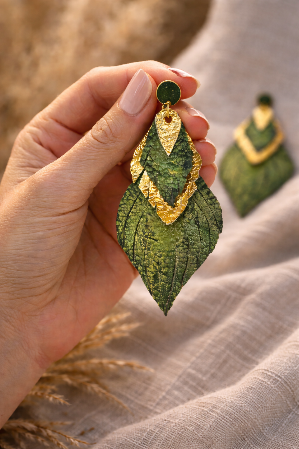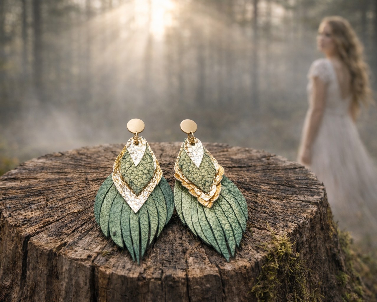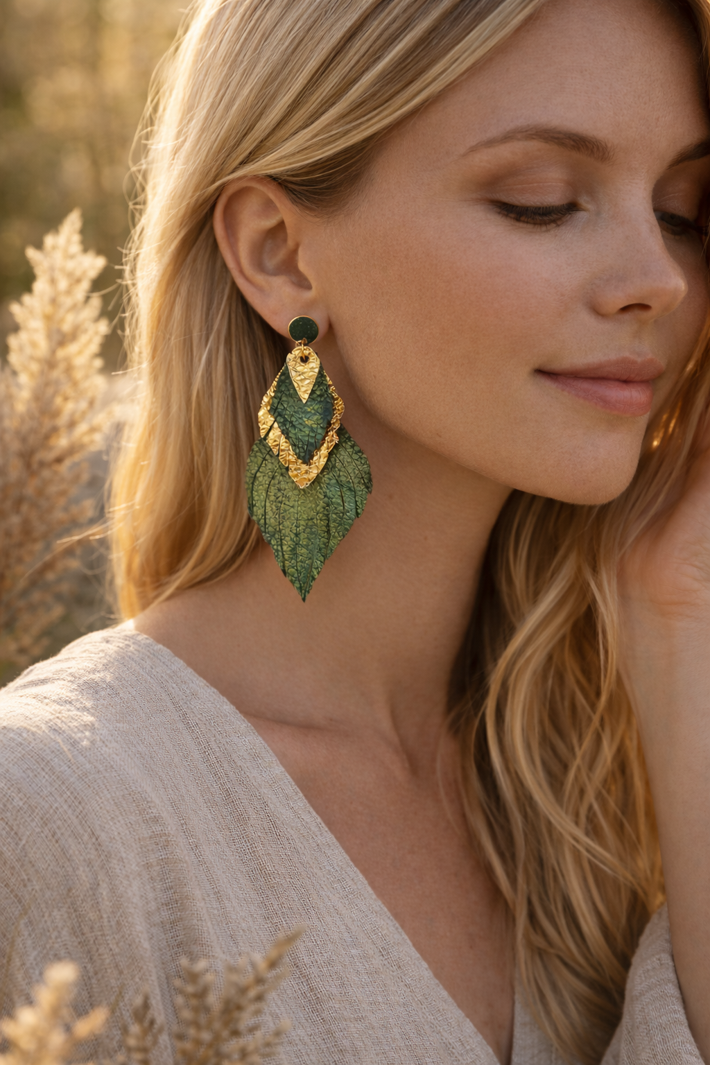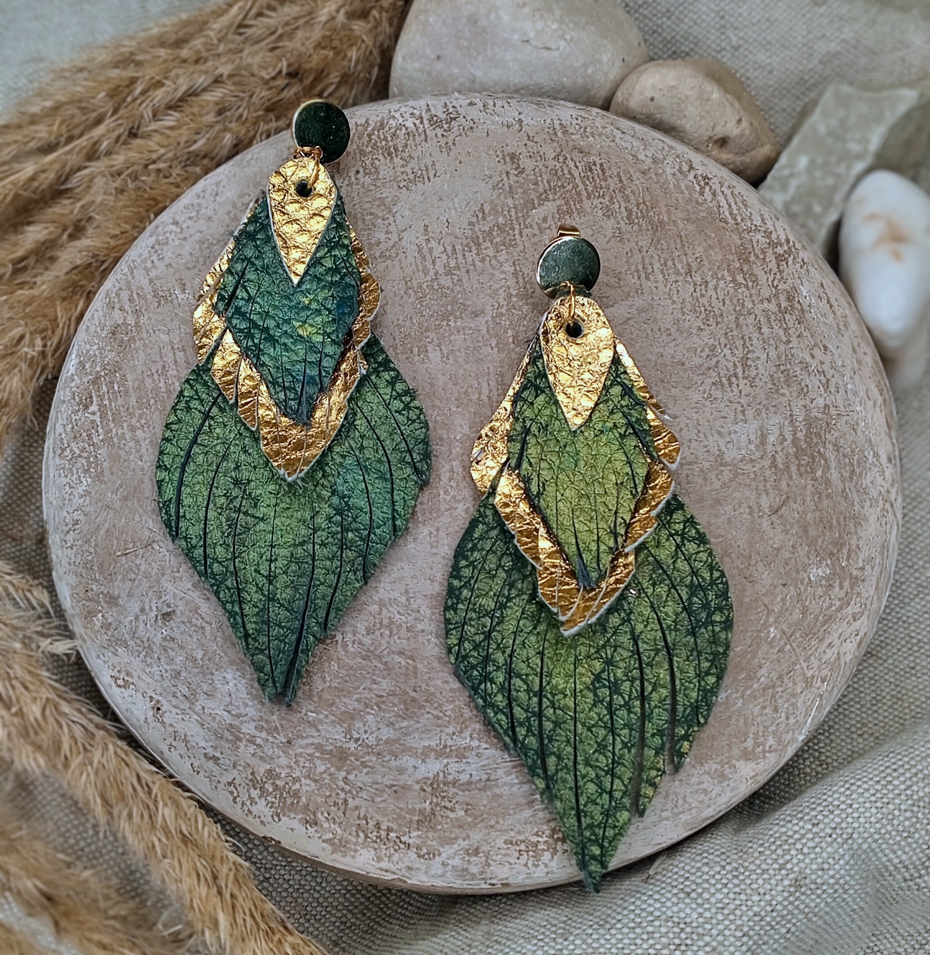 Käsintehdyt Mielikki Metsänhenki -korvakorut on valmistettu käsinmaalatusta nahasta. Luonnon inspiroima vihreän ja kullan sävy luo näyttävän mutta kevyen korun arkeen ja juhlaan.