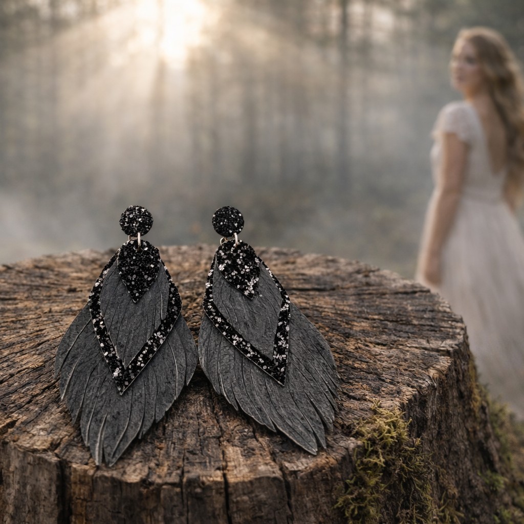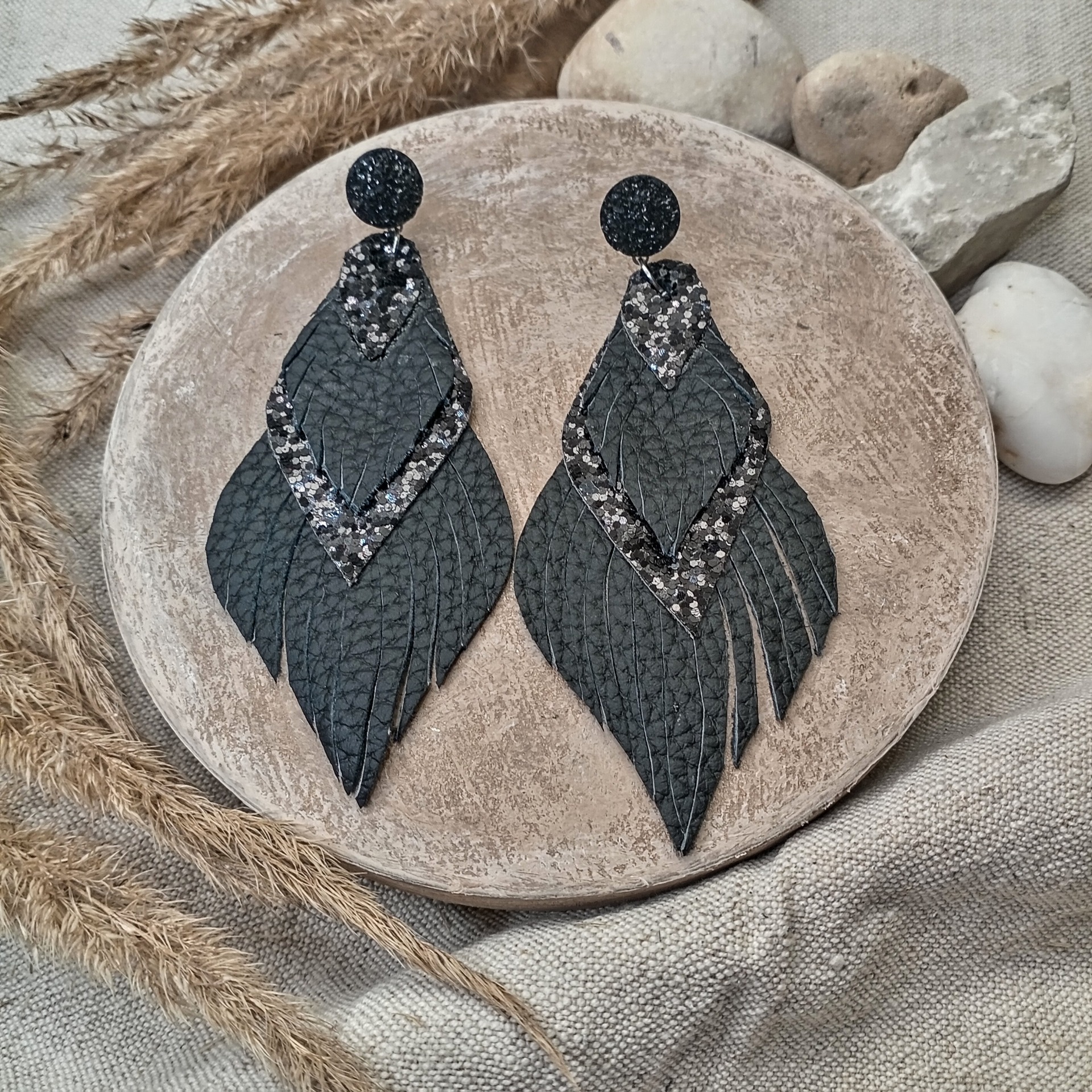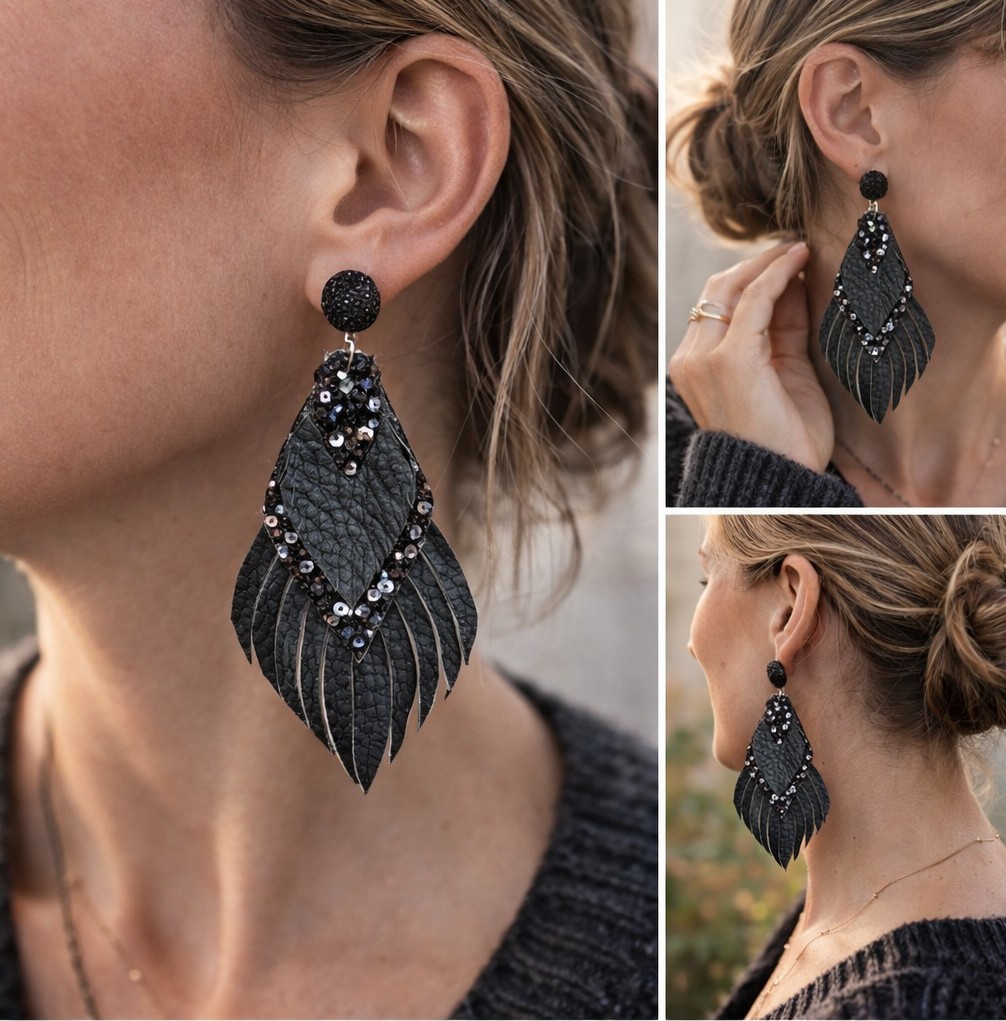 Mielikki Metsänhenki korvakorut aidosta nahasta ovat näyttävät mutta kevyet 10 cm pitkät korvakorut. Kerroksellinen muotoilu ja elegantti musta sävy tuovat boho-henkistä tyyliä arkeen ja juhlaan. Käsintehty design korostaa korun yksilöllistä kauneutta.