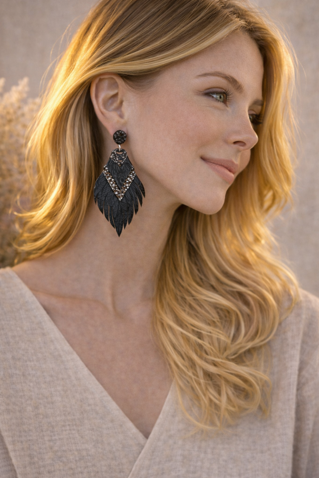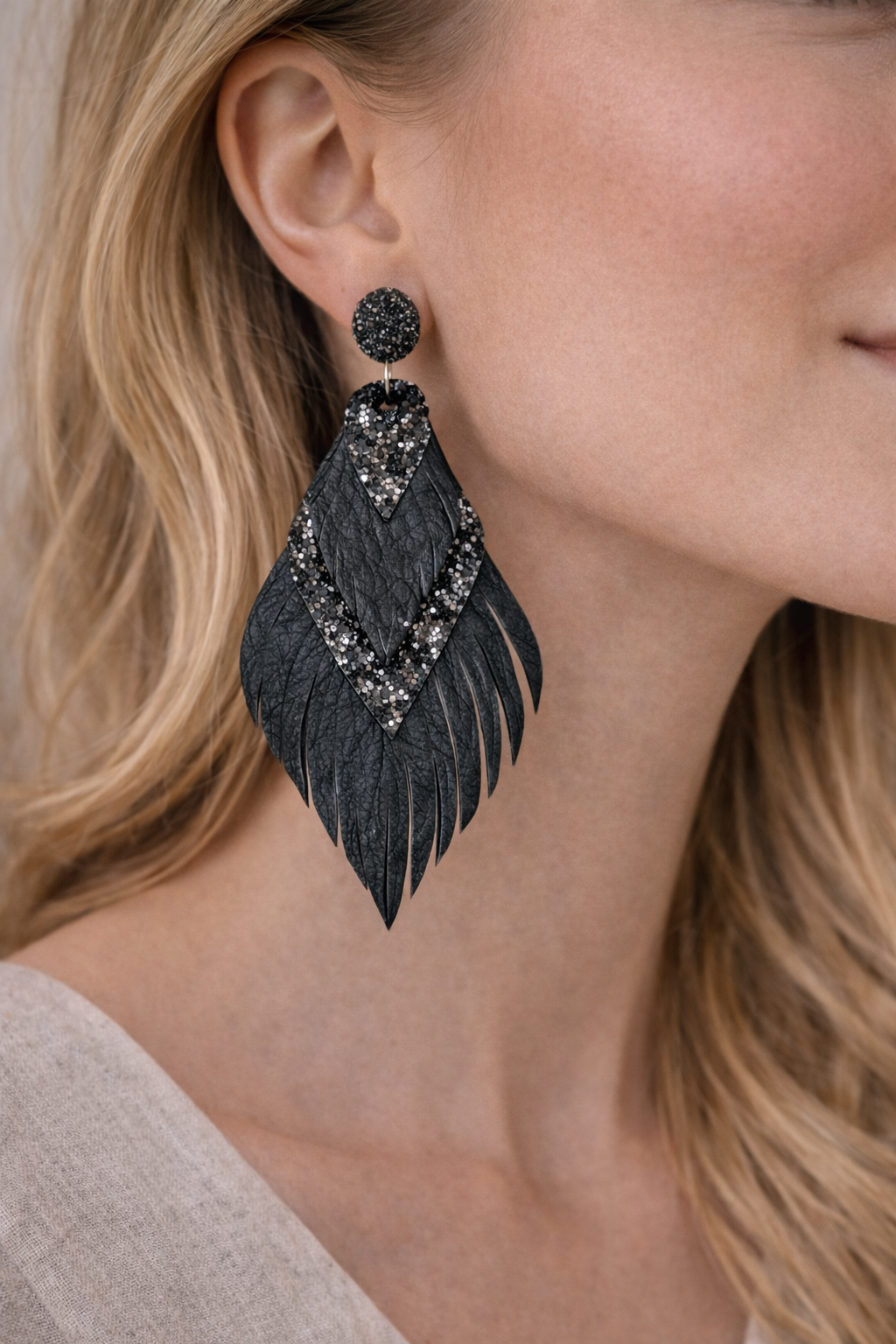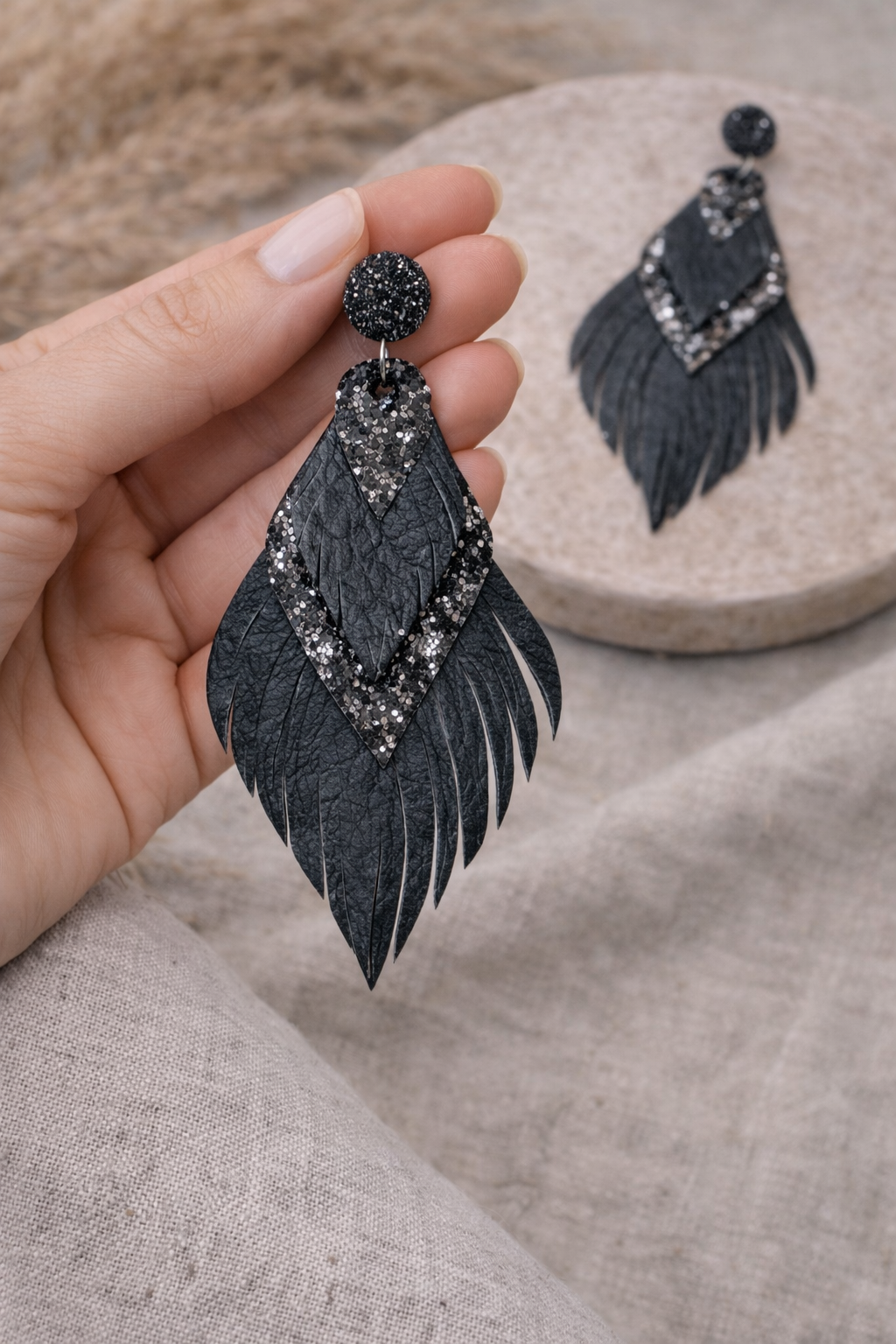 Mielikki Metsänhenki korvakorut aidosta nahasta ovat näyttävät mutta kevyet 10 cm pitkät korvakorut. Kerroksellinen muotoilu ja elegantti musta sävy tuovat boho-henkistä tyyliä arkeen ja juhlaan. Käsintehty design korostaa korun yksilöllistä kauneutta.