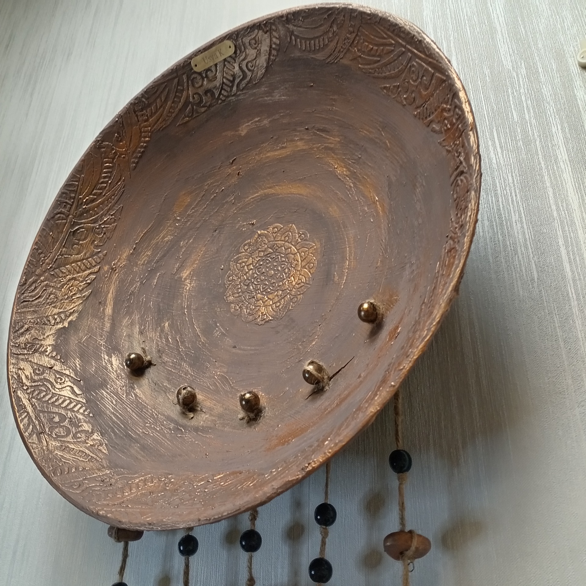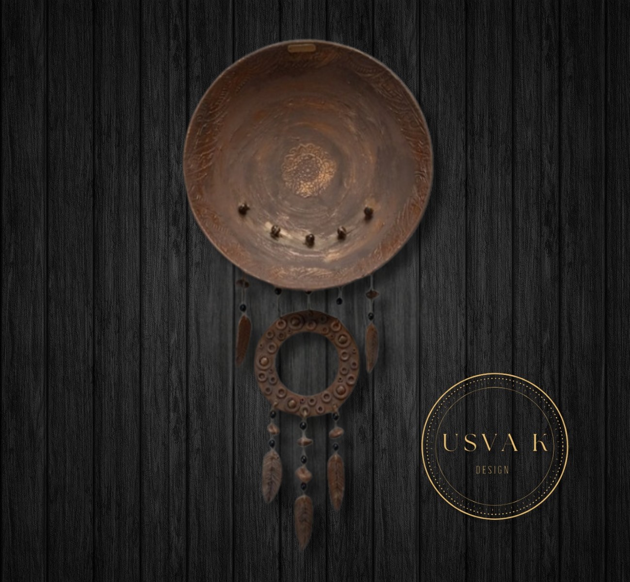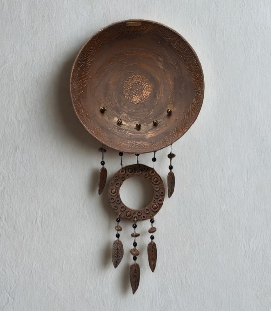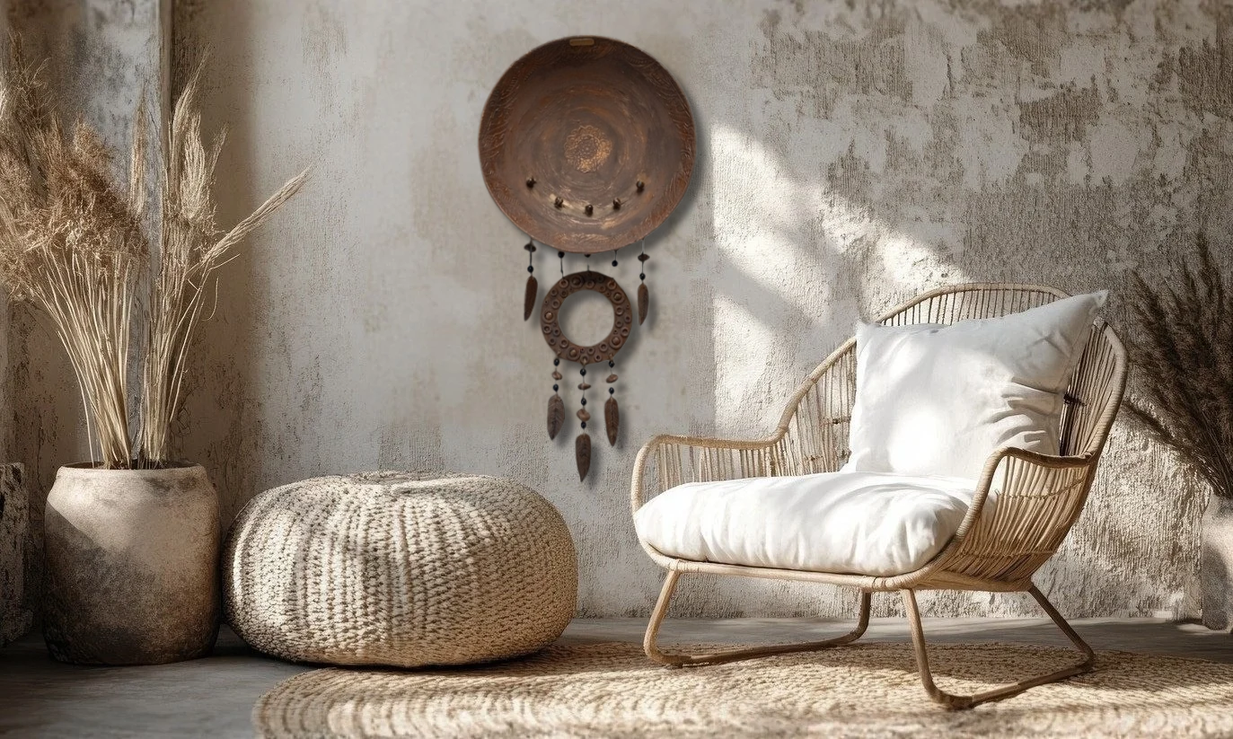Boheemi seinäkoriste! Pituus 85cm leveys 40cm! Tehty kierrätys löydöistä iso kulho puu vaneria ja pieni ympyrä muovia, kohokuviointi tehty tasoitteella, sulat ja pompulat muovailtu fimomassasta. Käsinmaalattu kalkkimaalilla ja akvarelliväreillä! Näitä saatavilla kaksi samanllaista! (Tuote kuvissa osa luotu tekoälyllä antamaan visuaalista ideaa eri sisustuksiin)