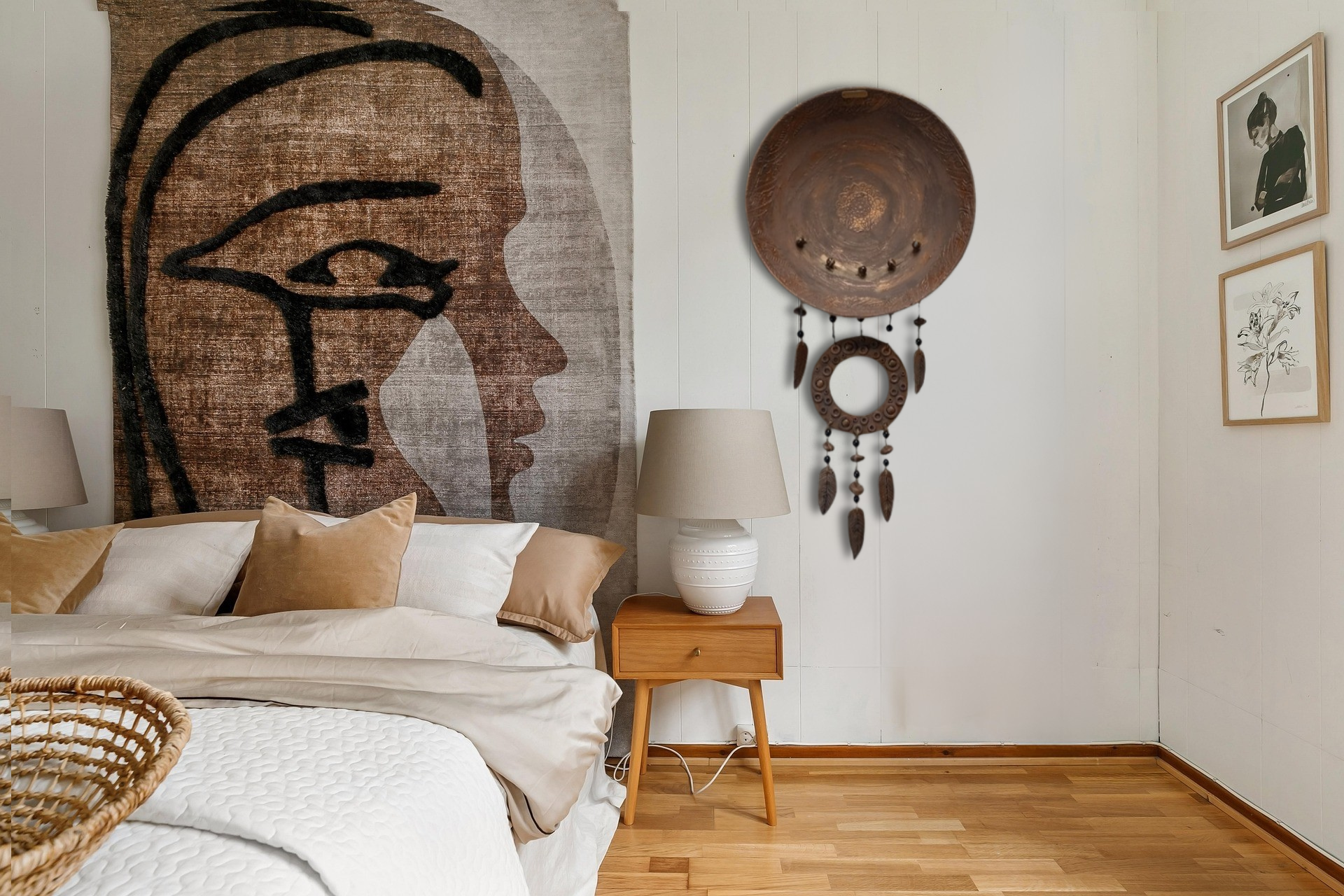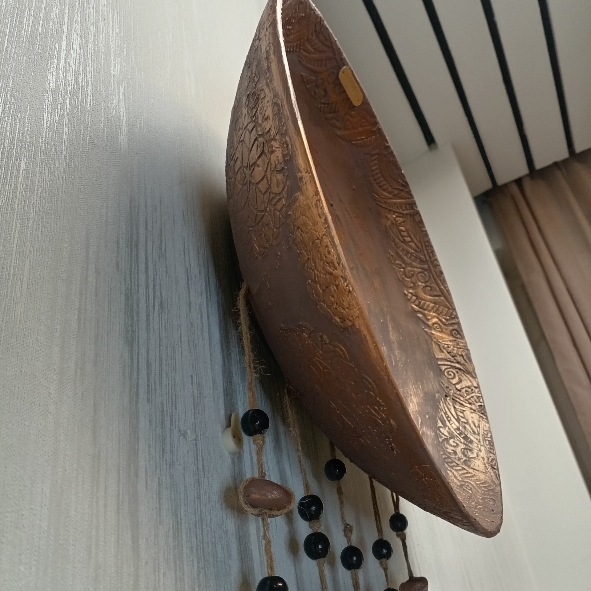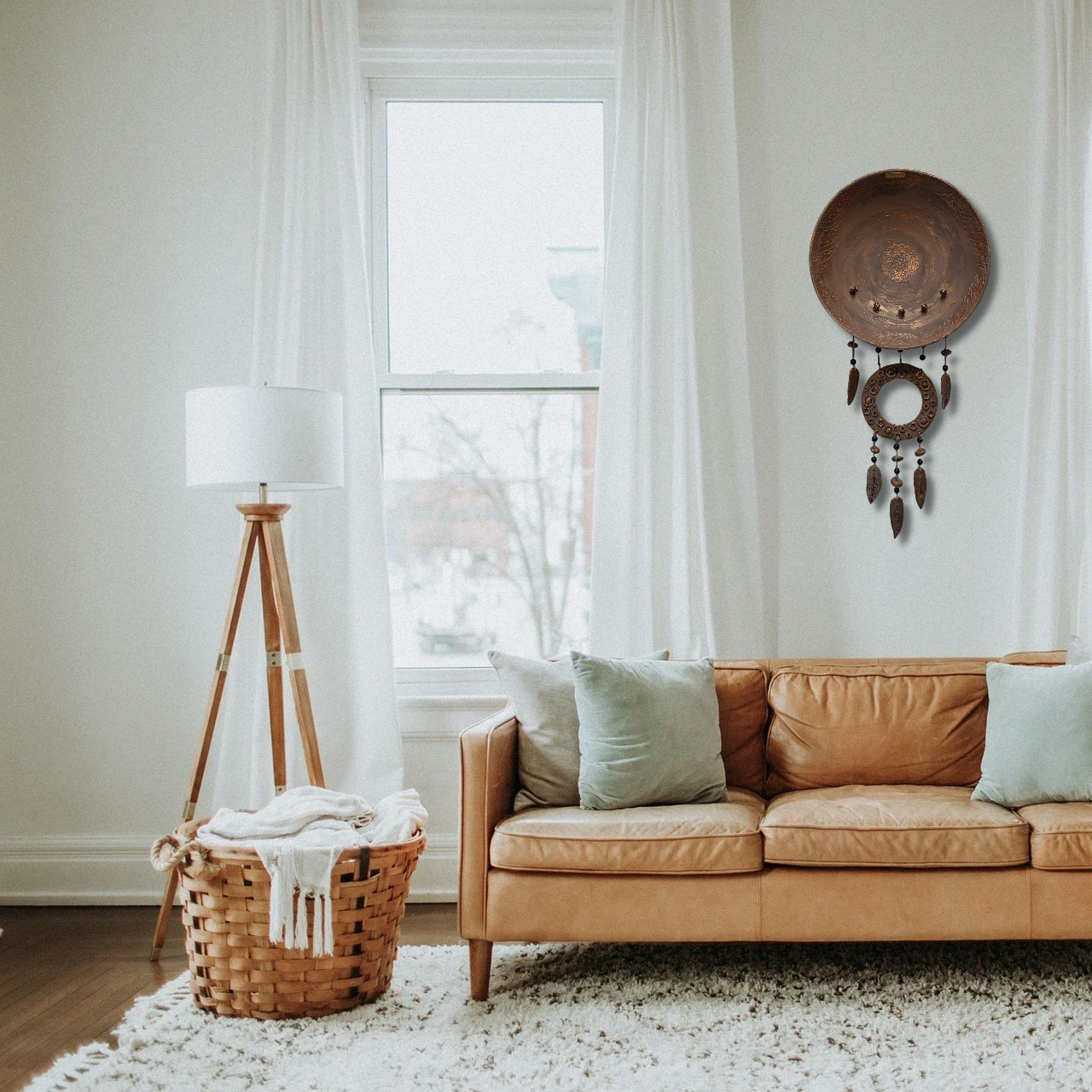 Boheemi seinäkoriste! Pituus 85cm leveys 40cm! Tehty kierrätys löydöistä iso kulho puu vaneria ja pieni ympyrä muovia, kohokuviointi tehty tasoitteella, sulat ja pompulat muovailtu fimomassasta. Käsinmaalattu kalkkimaalilla ja akvarelliväreillä! Näitä saatavilla kaksi samanllaista! (Tuote kuvissa osa luotu tekoälyllä antamaan visuaalista ideaa eri sisustuksiin)