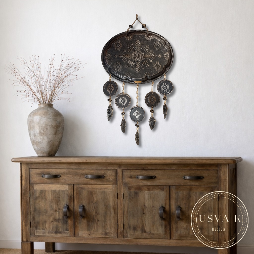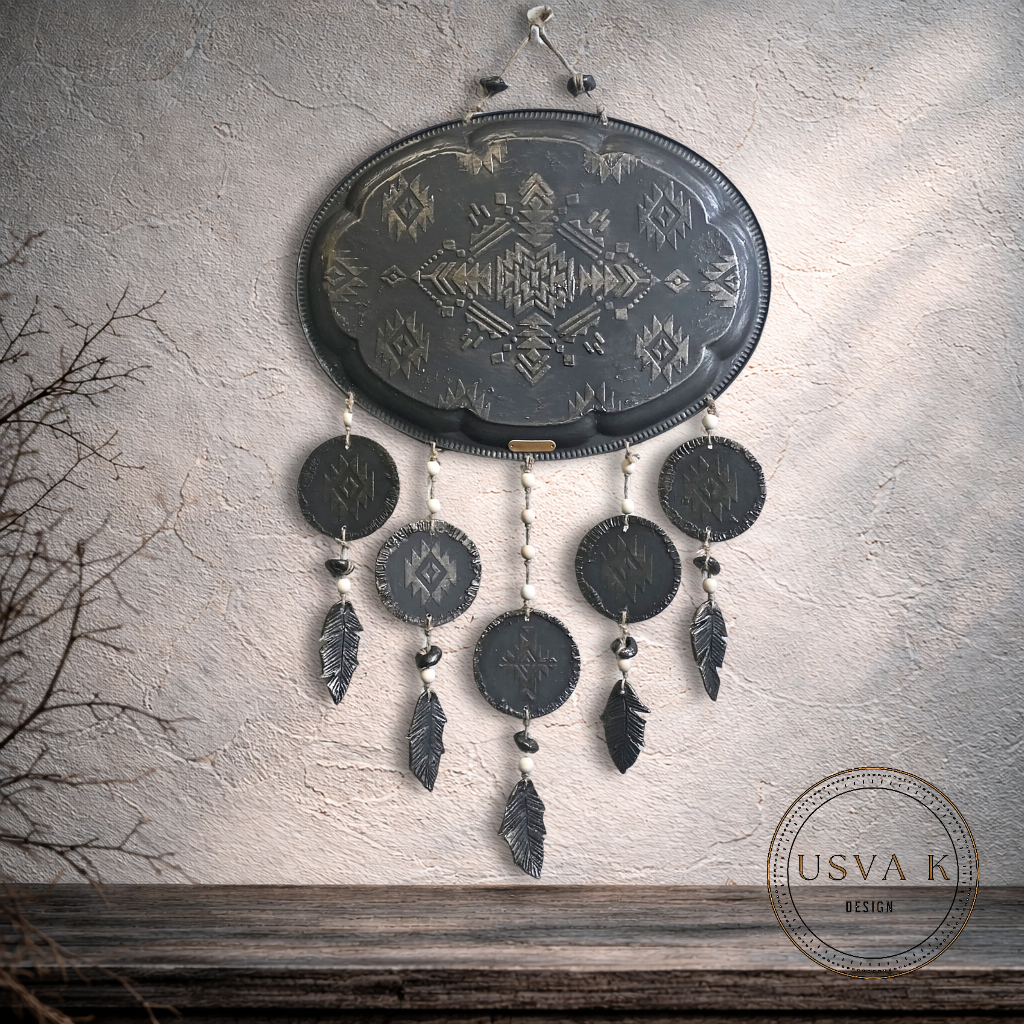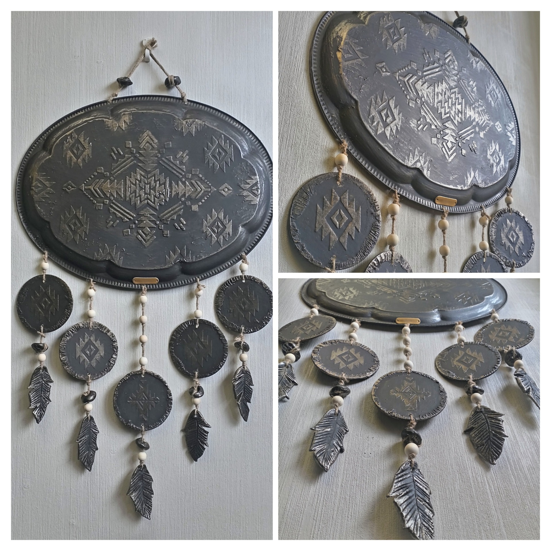 Tyylikäs seinäkoriste, jossa tummanharmaa sävy ja geometrinen kuviointi. Riipukset puu ja savi helmiä. Sulat muotoiltu savesta ne tuovat keveyttä ja luonnollista tunnelmaa. Sopii täydellisesti boho-, skandinaaviseen ja rustiikkiseen sisustukseen. Pituus ripustus narusta alimpaan sulkaan 76cm leveys 45cm