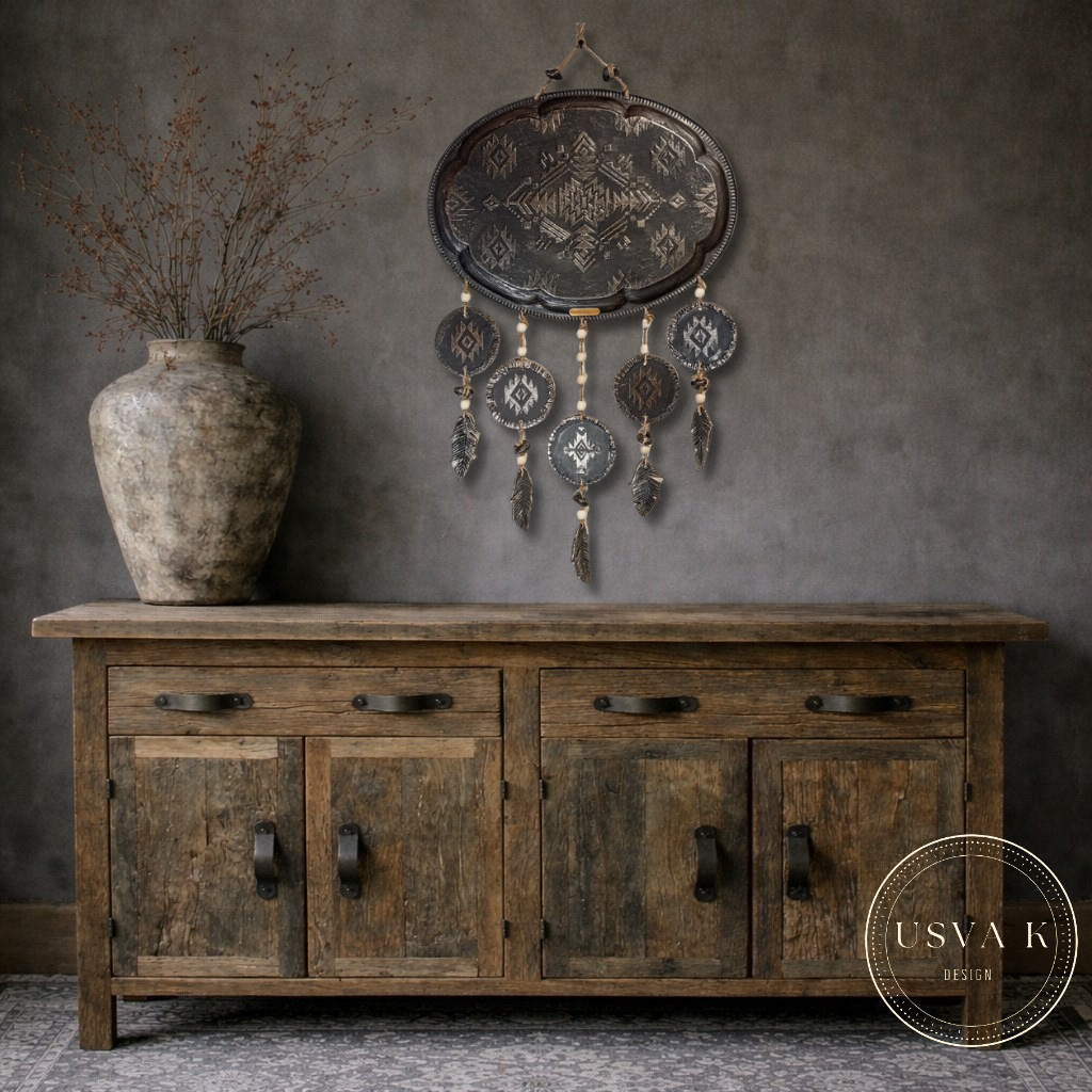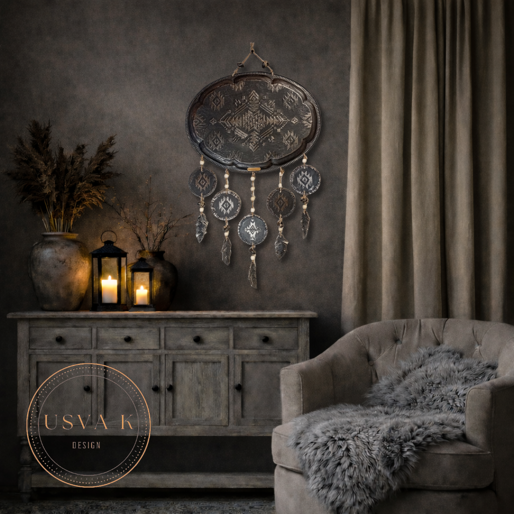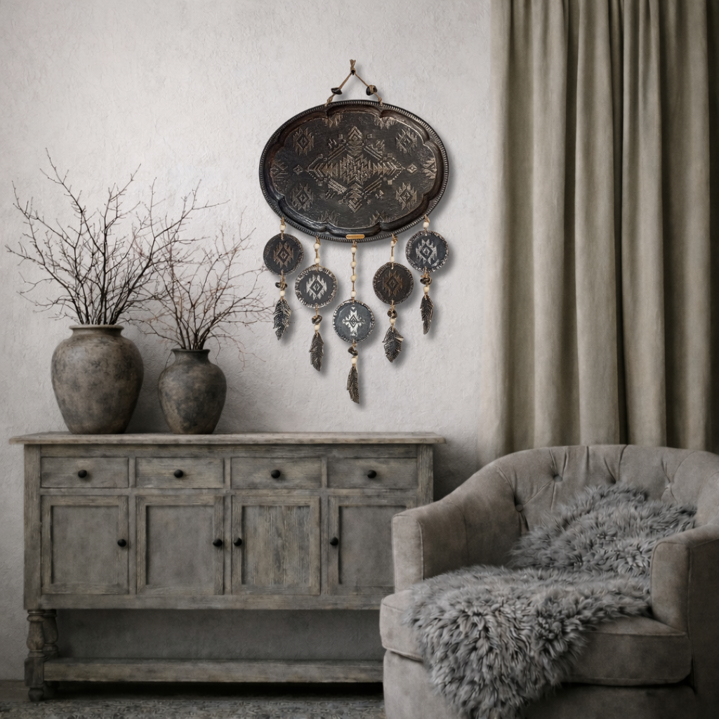 Tyylikäs seinäkoriste, jossa tummanharmaa sävy ja geometrinen kuviointi. Riipukset puu ja savi helmiä. Sulat muotoiltu savesta ne tuovat keveyttä ja luonnollista tunnelmaa. Sopii täydellisesti boho-, skandinaaviseen ja rustiikkiseen sisustukseen. Pituus ripustus narusta alimpaan sulkaan 76cm leveys 45cm