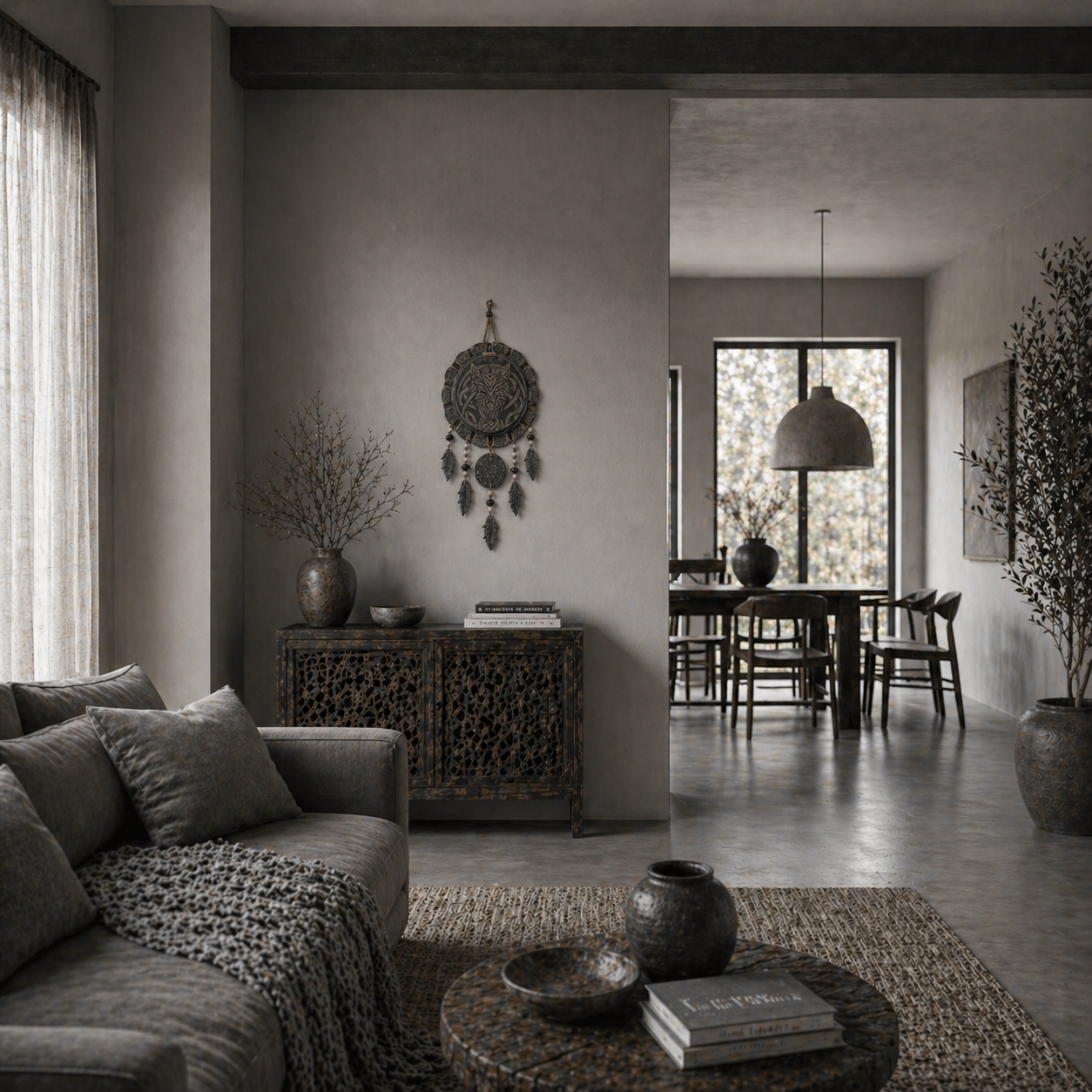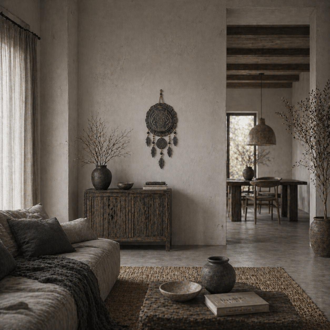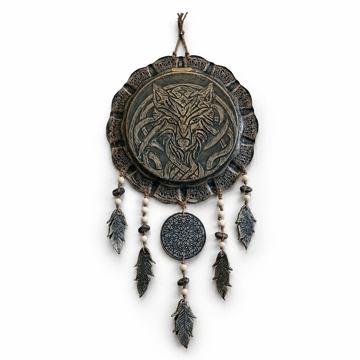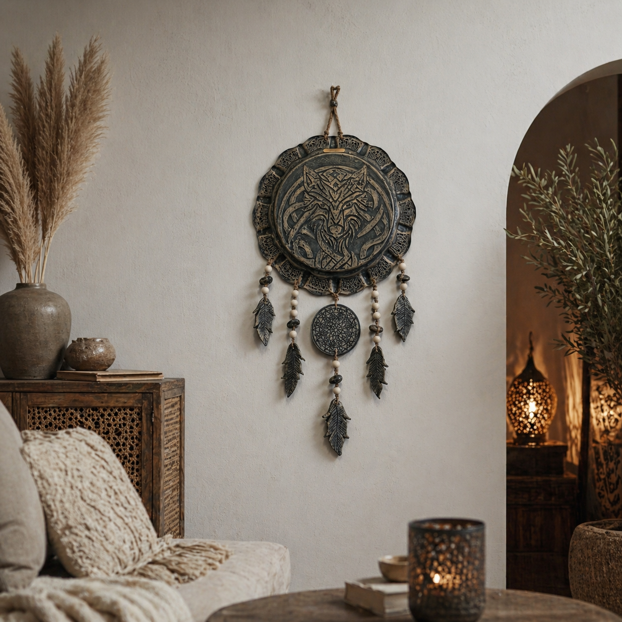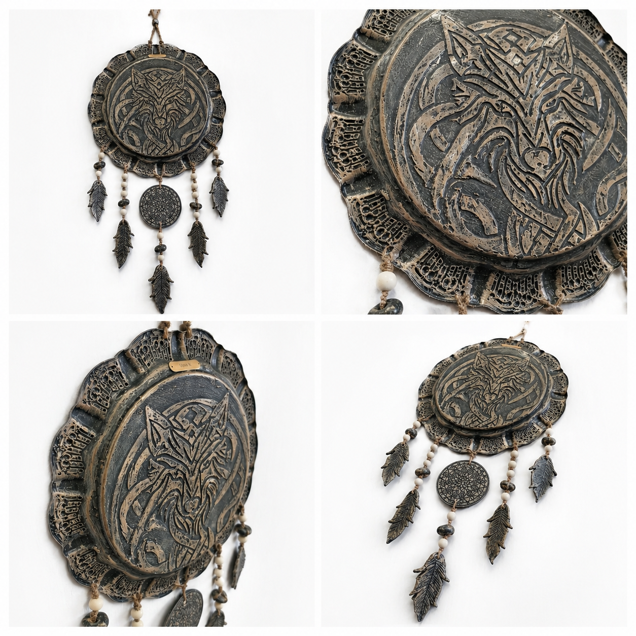 Näyttävä käsintehty seinäkoriste, jossa voimaeläimenä susi symboloi voimaa, suojaa ja yhteyttä luontoon. Rouhea pinta, maanläheiset sävyt ja yksityiskohtaiset riipukset luovat syvän, hieman mystisen tunnelman. Täydellinen katseenvangitsija boho-, wabi sabi- ja tumman skandinaaviseen sisustukseen.