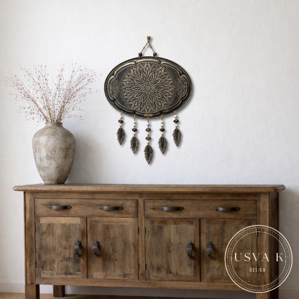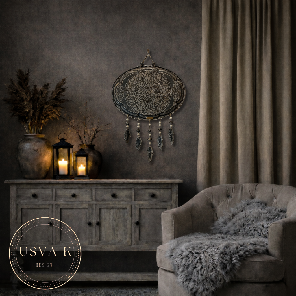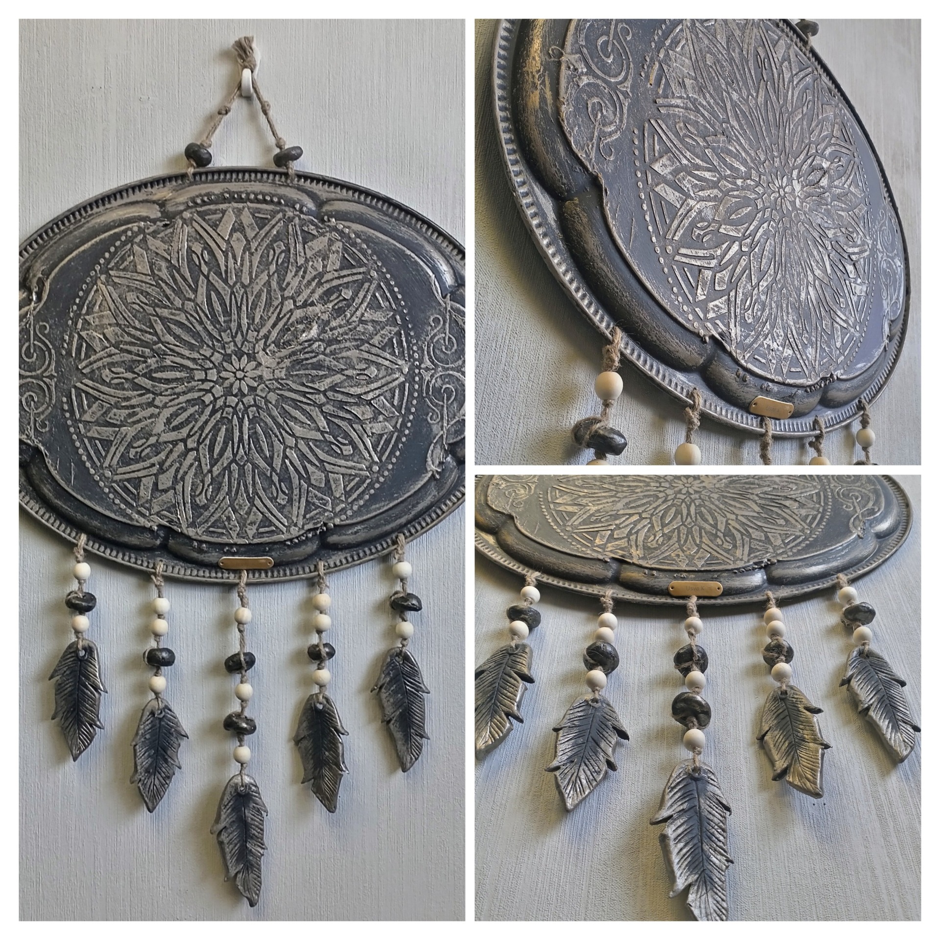 Boheemi mandala kuvioitu seinäkoriste! Huoneen katseen vangitsija, luonnon läheisissä, rustiikkisissa sävyissä. Sopii Nordic boho style tyyliin kuin mökki tunnelmaankin koko:65cm ripustus narusta alimpaan sulkaan leveys 45cm.