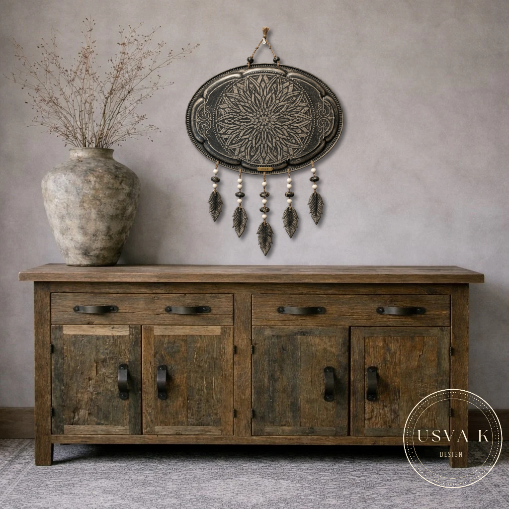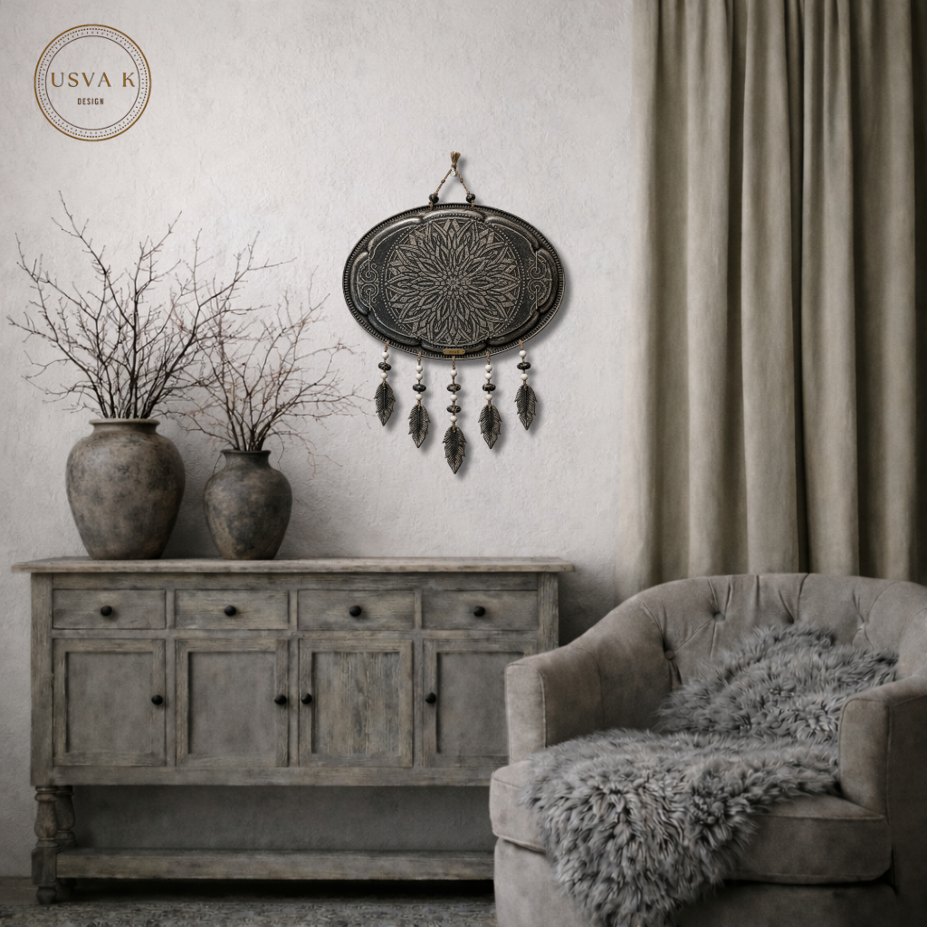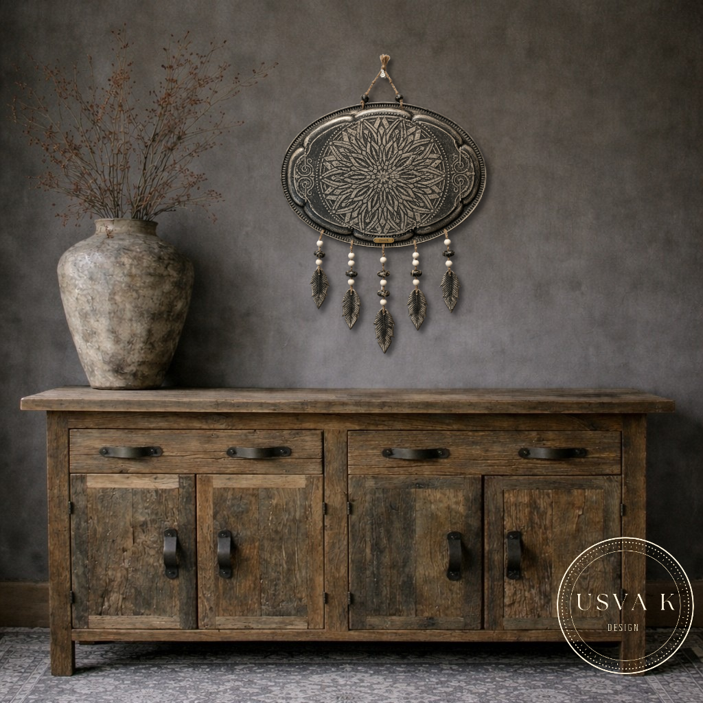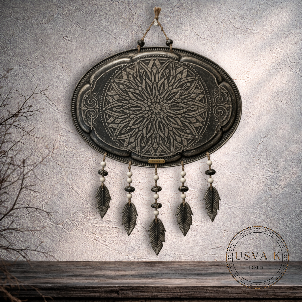 Boheemi mandala kuvioitu seinäkoriste! Huoneen katseen vangitsija, luonnon läheisissä, rustiikkisissa sävyissä. Sopii Nordic boho style tyyliin kuin mökki tunnelmaankin koko:65cm ripustus narusta alimpaan sulkaan leveys 45cm.