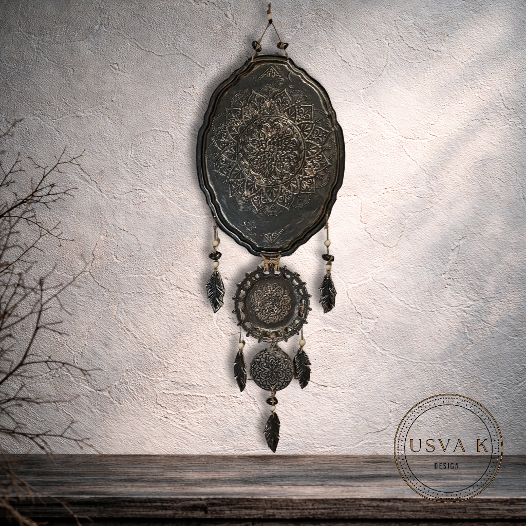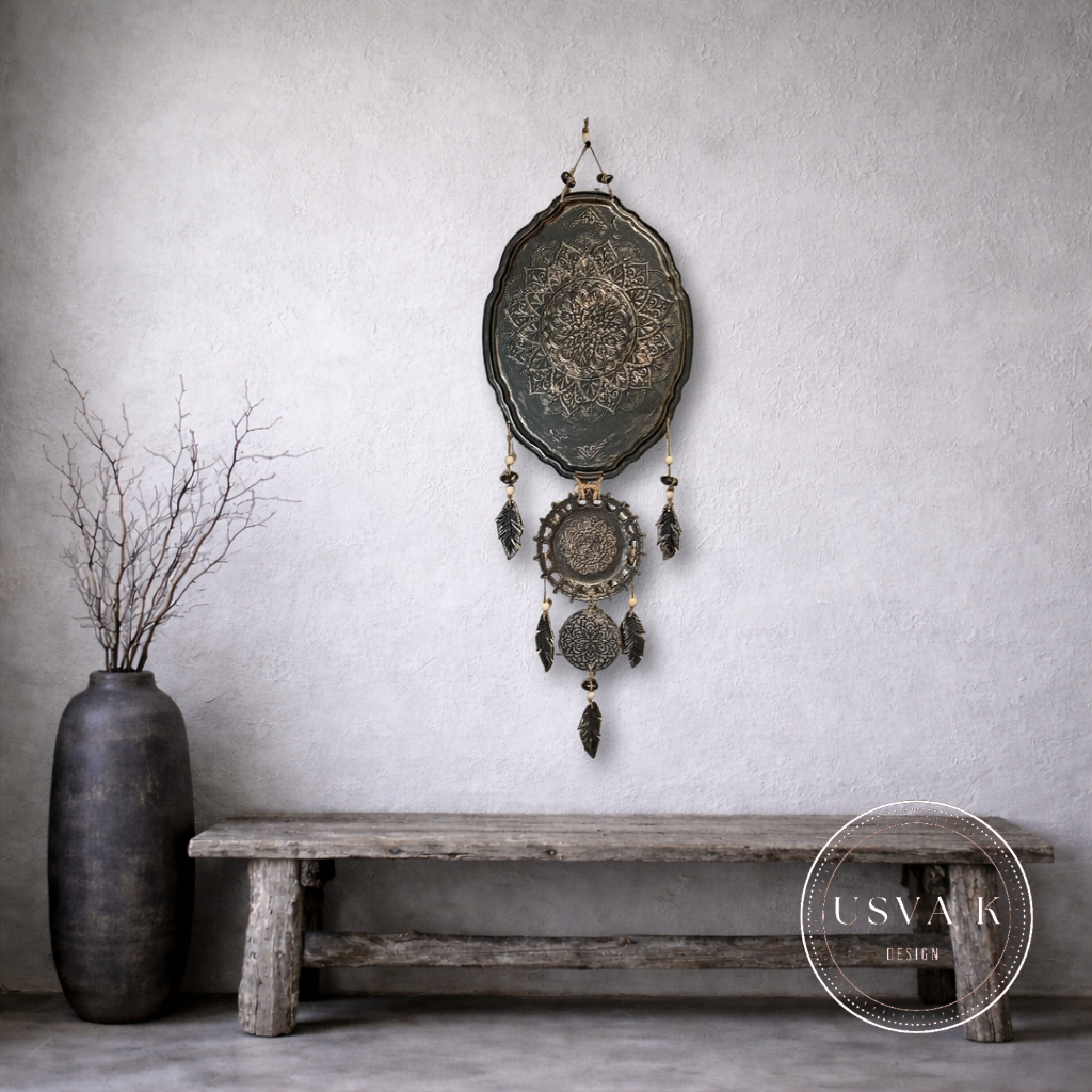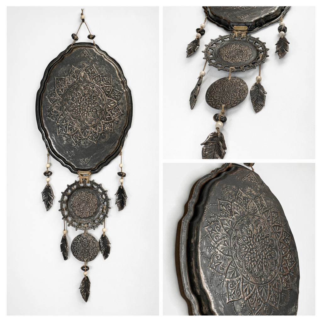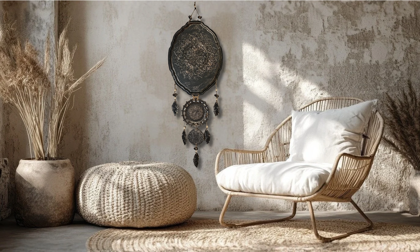 Nordic Boho-henkinen metallia ja savea seinäkoriste tuo kotiin harmonista ja mystistä tunnelmaa. Mandala-kuviointi ja rustiikkinen viimeistely sopivat täydellisesti skandinaaviseen, boheemiin ja luonnonläheiseen sisustukseen.