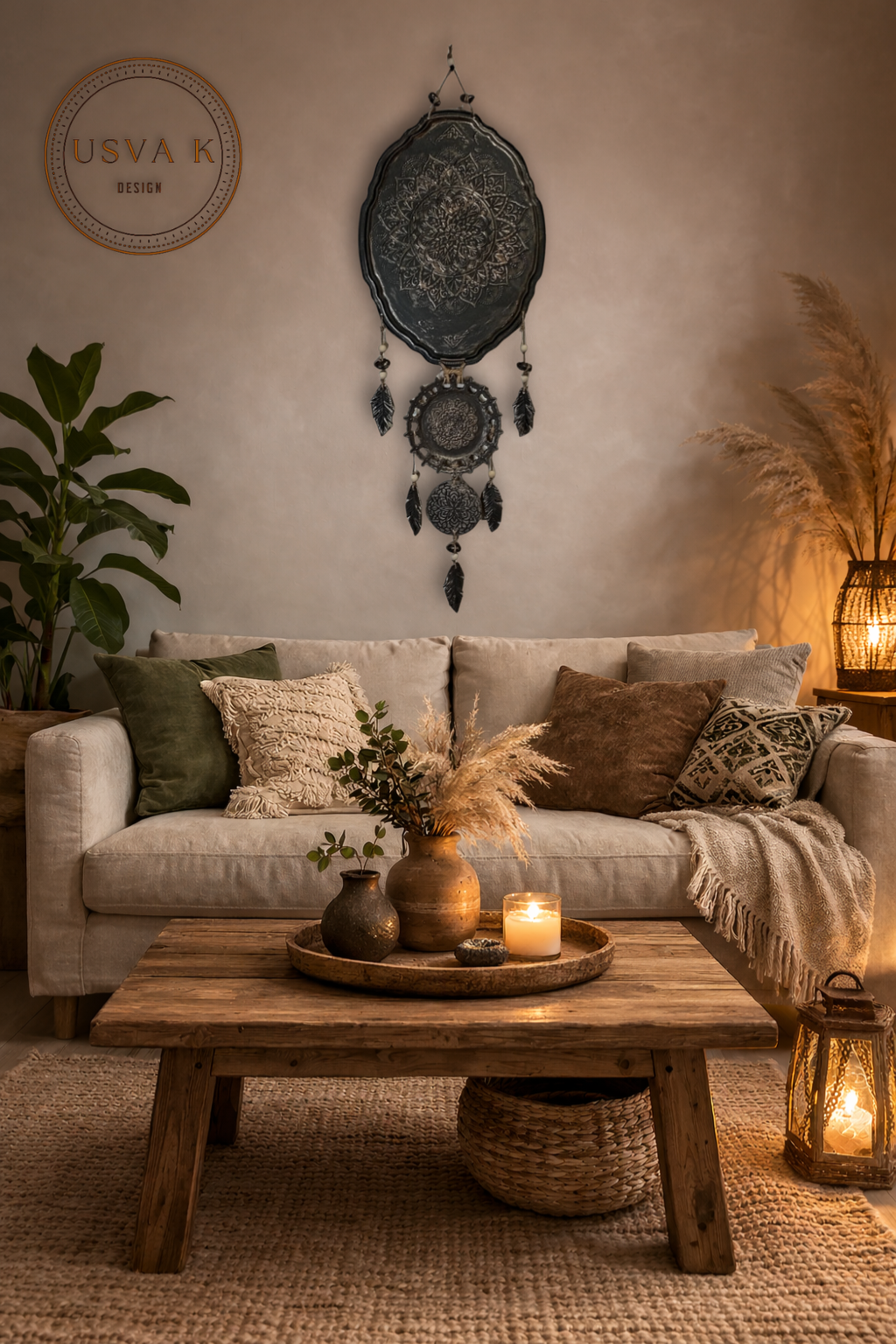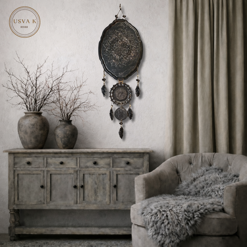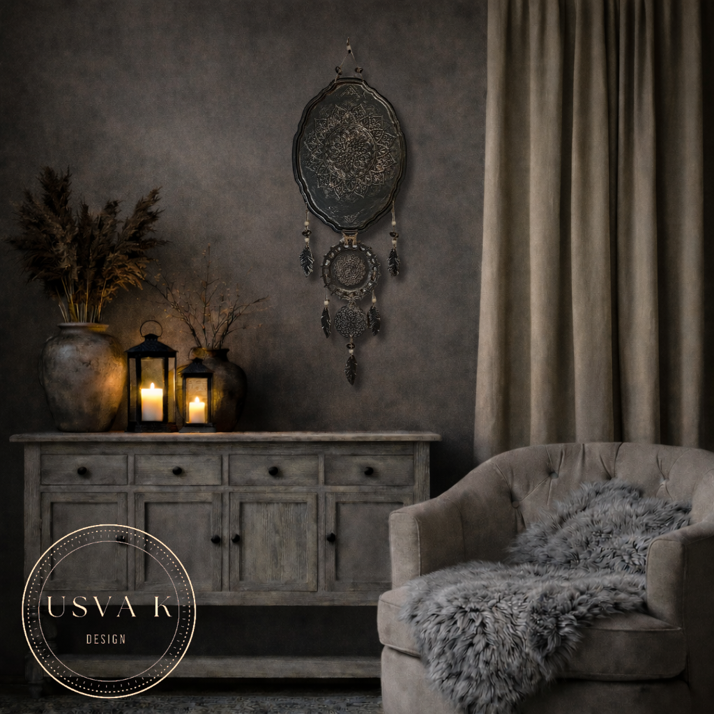 Nordic Boho-henkinen metallia ja savea seinäkoriste tuo kotiin harmonista ja mystistä tunnelmaa. Mandala-kuviointi ja rustiikkinen viimeistely sopivat täydellisesti skandinaaviseen, boheemiin ja luonnonläheiseen sisustukseen.