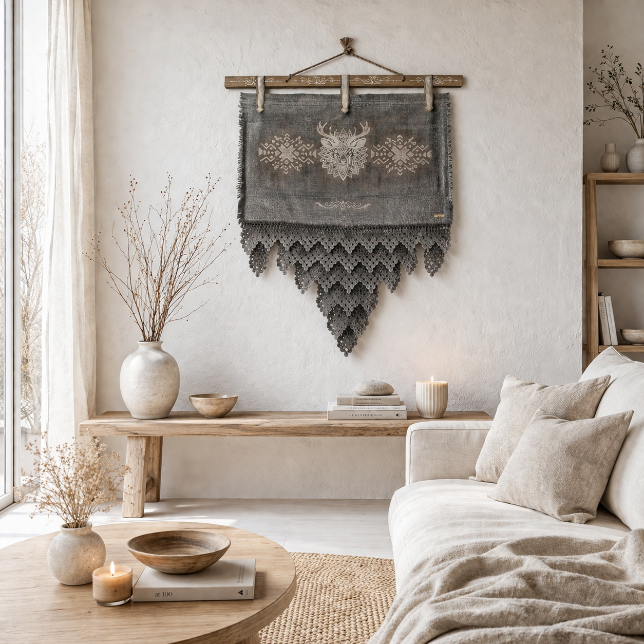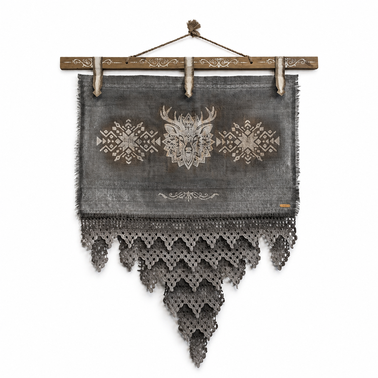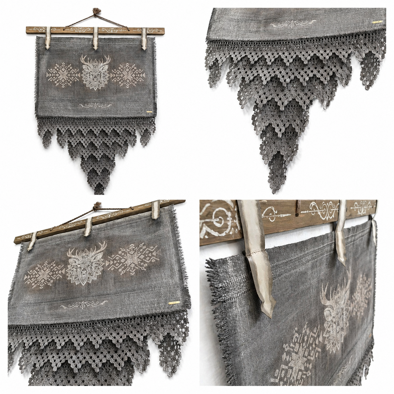 Usva K:n käsintehty seinävaate tuo kotiin rauhallista, luonnonläheistä tunnelmaa. Pehmeät harmaan sävyt, peuranpää kuviointi ja näyttävä pitsimäinen alaosa tekevät siitä katseenvangitsijan niin moderniin kuin rustiikkiseen sisustukseen.