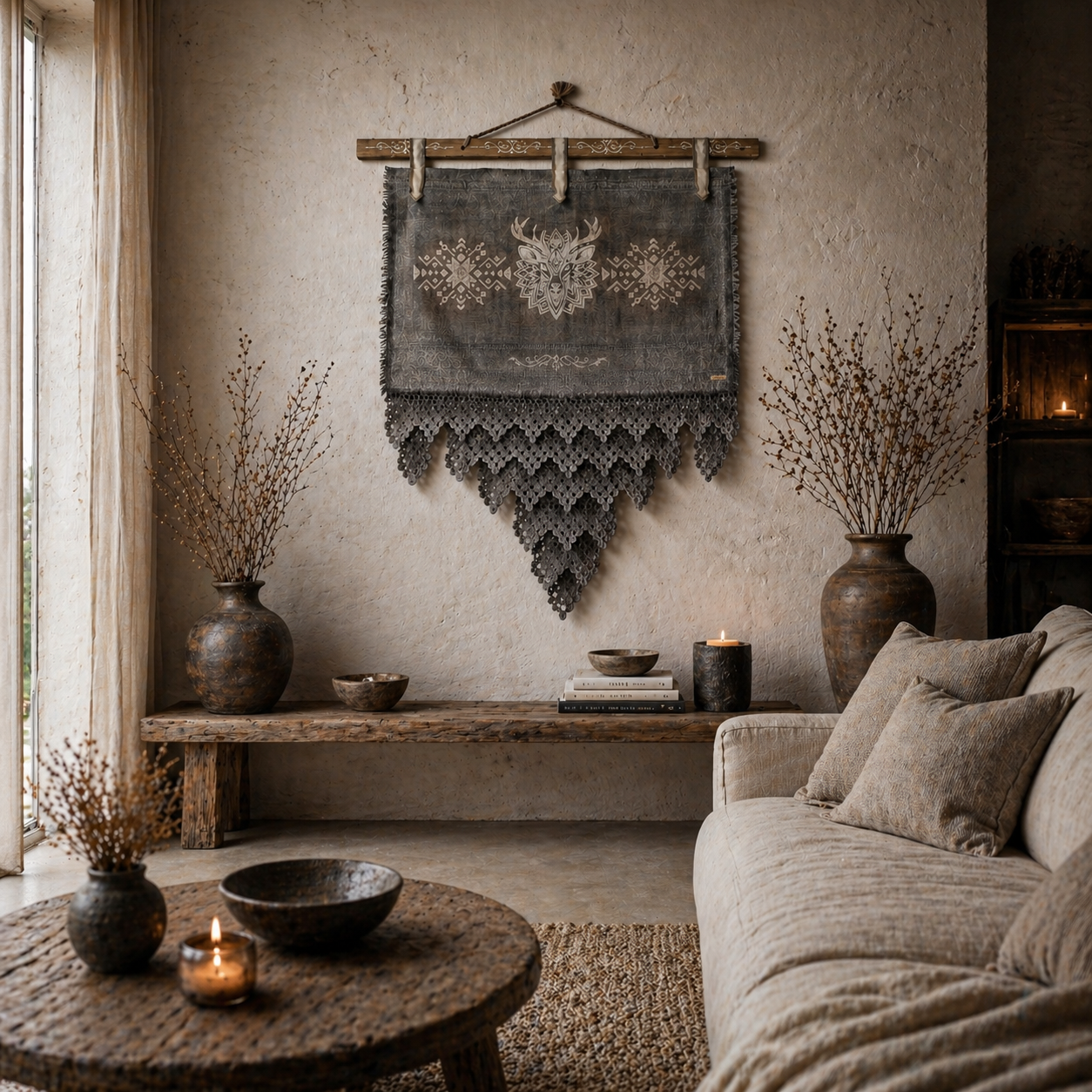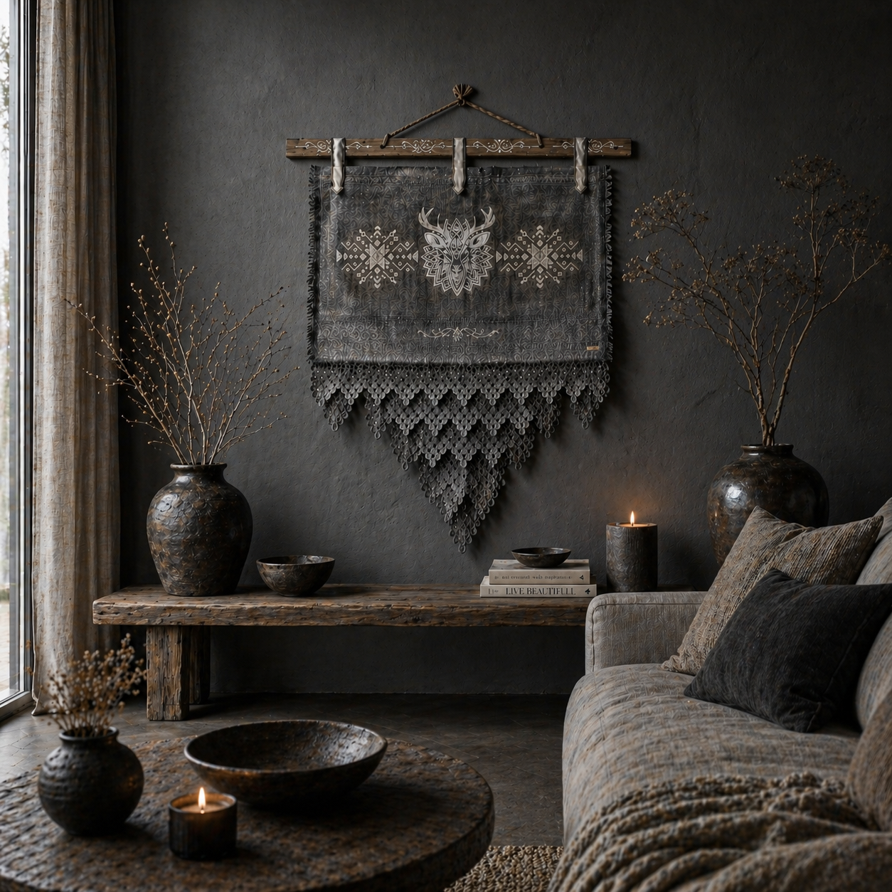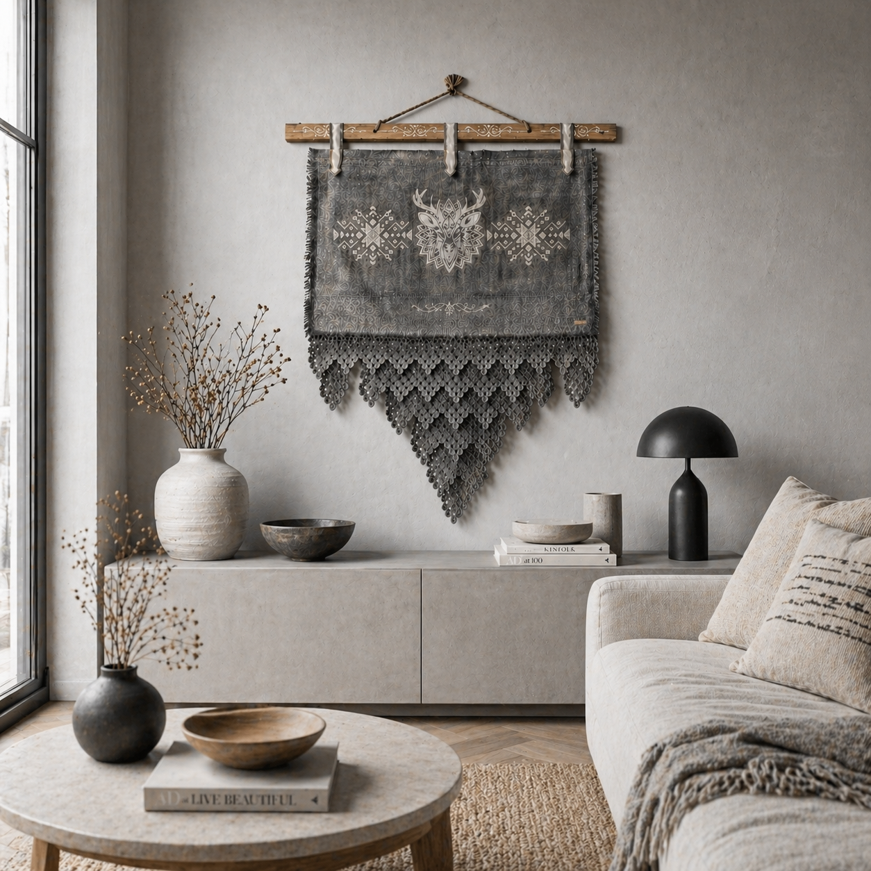 Usva K:n käsintehty seinävaate tuo kotiin rauhallista, luonnonläheistä tunnelmaa. Pehmeät harmaan sävyt, peuranpää kuviointi ja näyttävä pitsimäinen alaosa tekevät siitä katseenvangitsijan niin moderniin kuin rustiikkiseen sisustukseen.