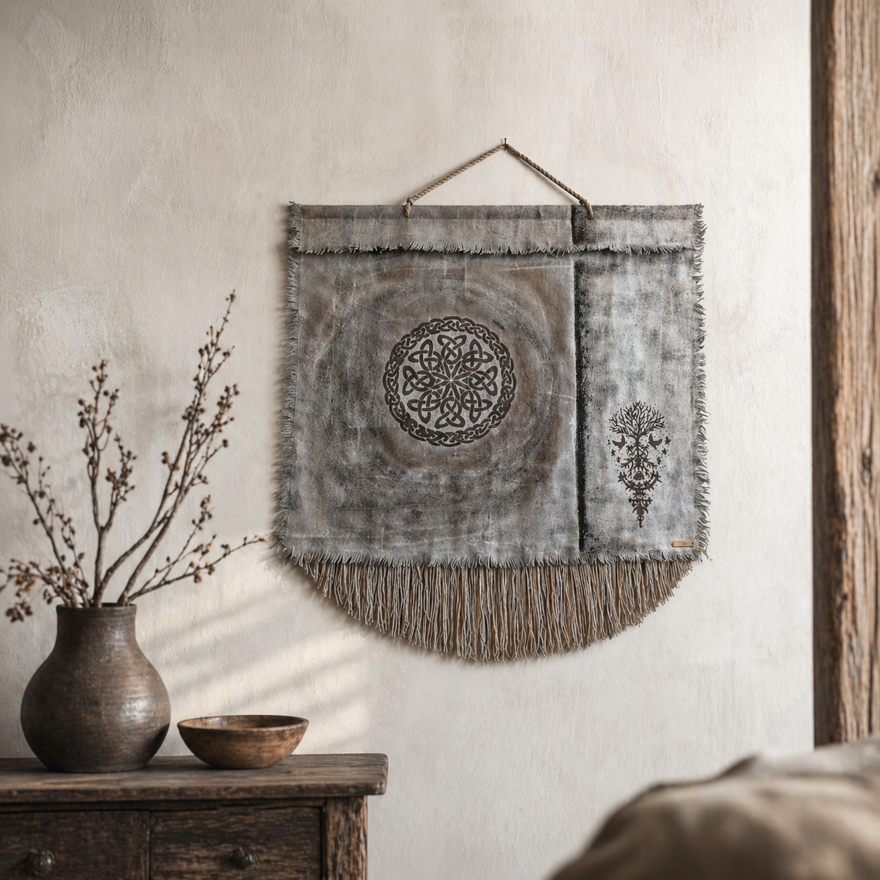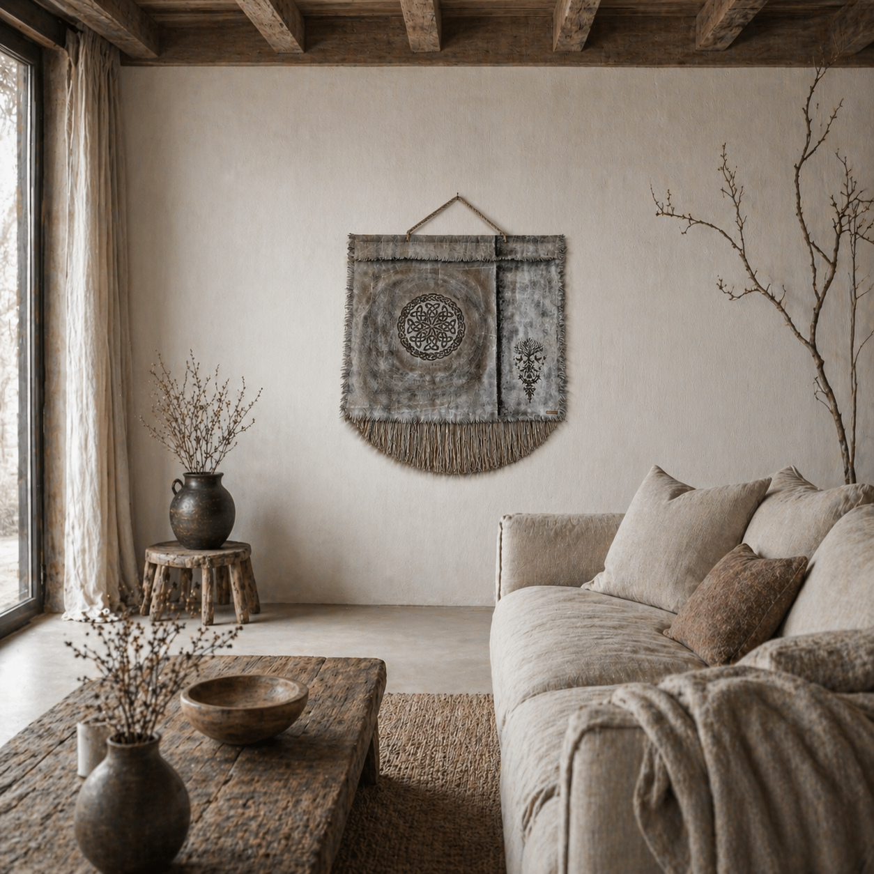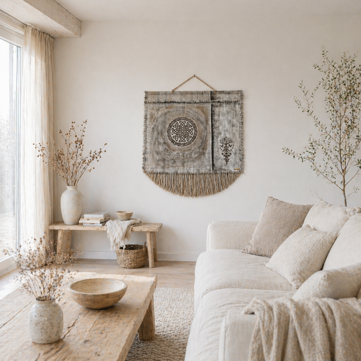 Usva K:n käsintehty seinävaate yhdistää pehmeät maanläheiset sävyt ja yksityiskohtaisen kuvioinnin harmoniseksi kokonaisuudeksi. Hapsutettu alaosa ja tarkat kuviot tuovat sisustukseen lämpöä ja persoonallisuutta. Sopii täydellisesti skandinaaviseen, boho- ja wabi sabi -tyyliin.