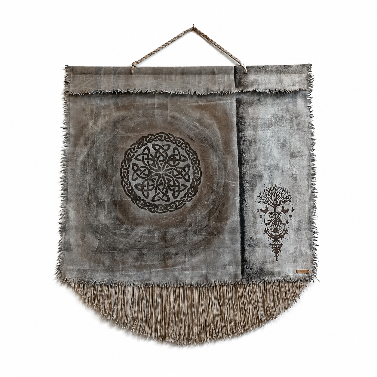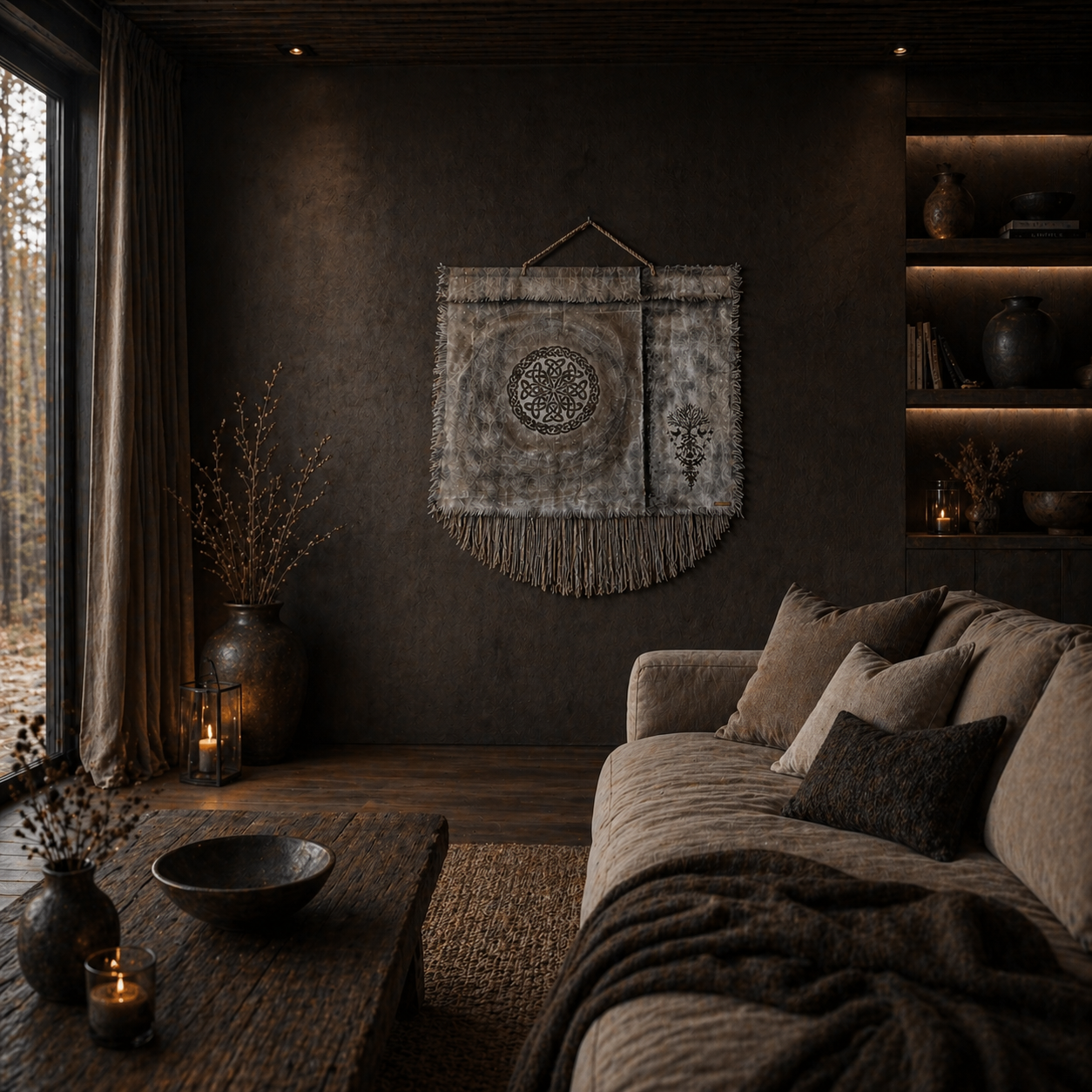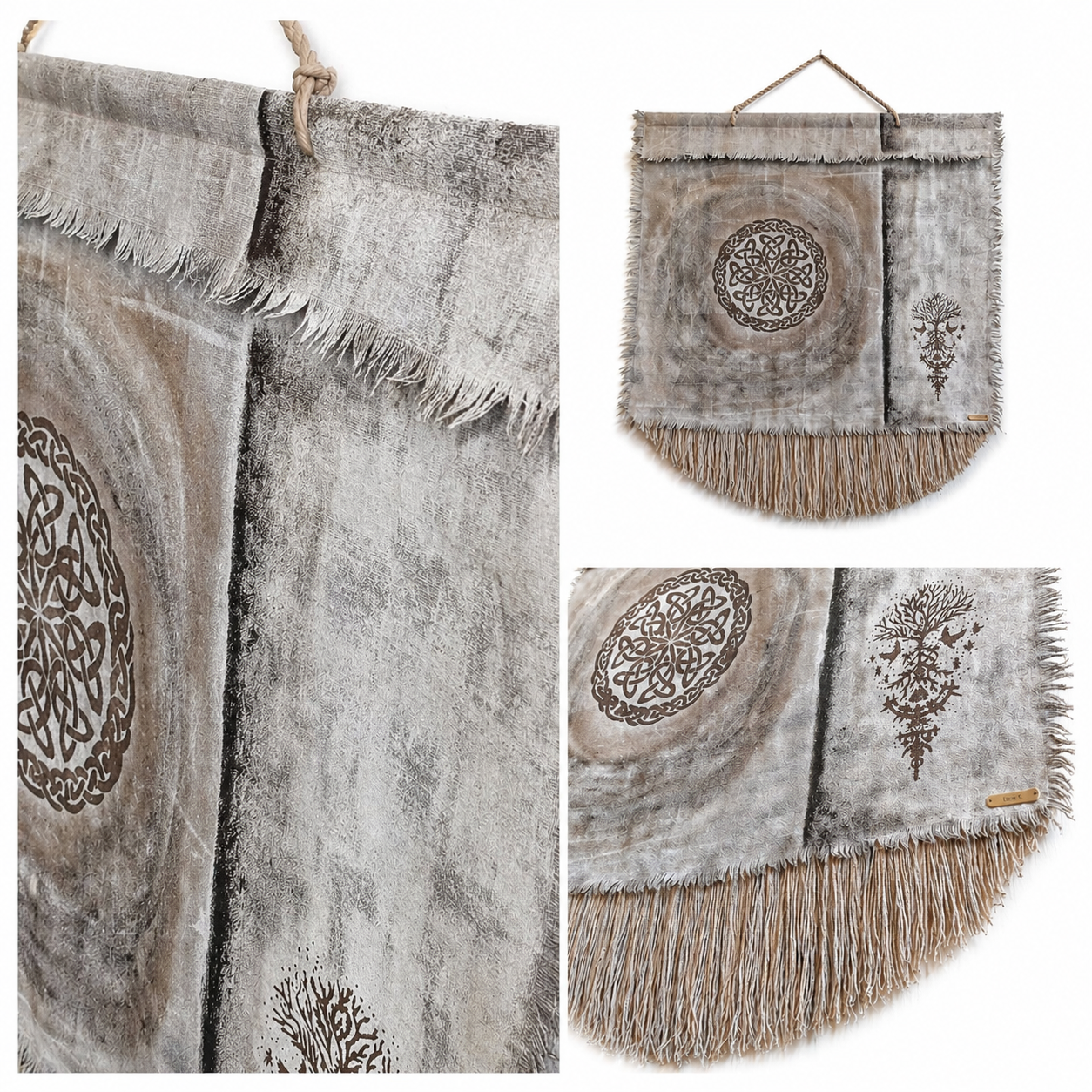 Usva K:n käsintehty seinävaate yhdistää pehmeät maanläheiset sävyt ja yksityiskohtaisen kuvioinnin harmoniseksi kokonaisuudeksi. Hapsutettu alaosa ja tarkat kuviot tuovat sisustukseen lämpöä ja persoonallisuutta. Sopii täydellisesti skandinaaviseen, boho- ja wabi sabi -tyyliin.