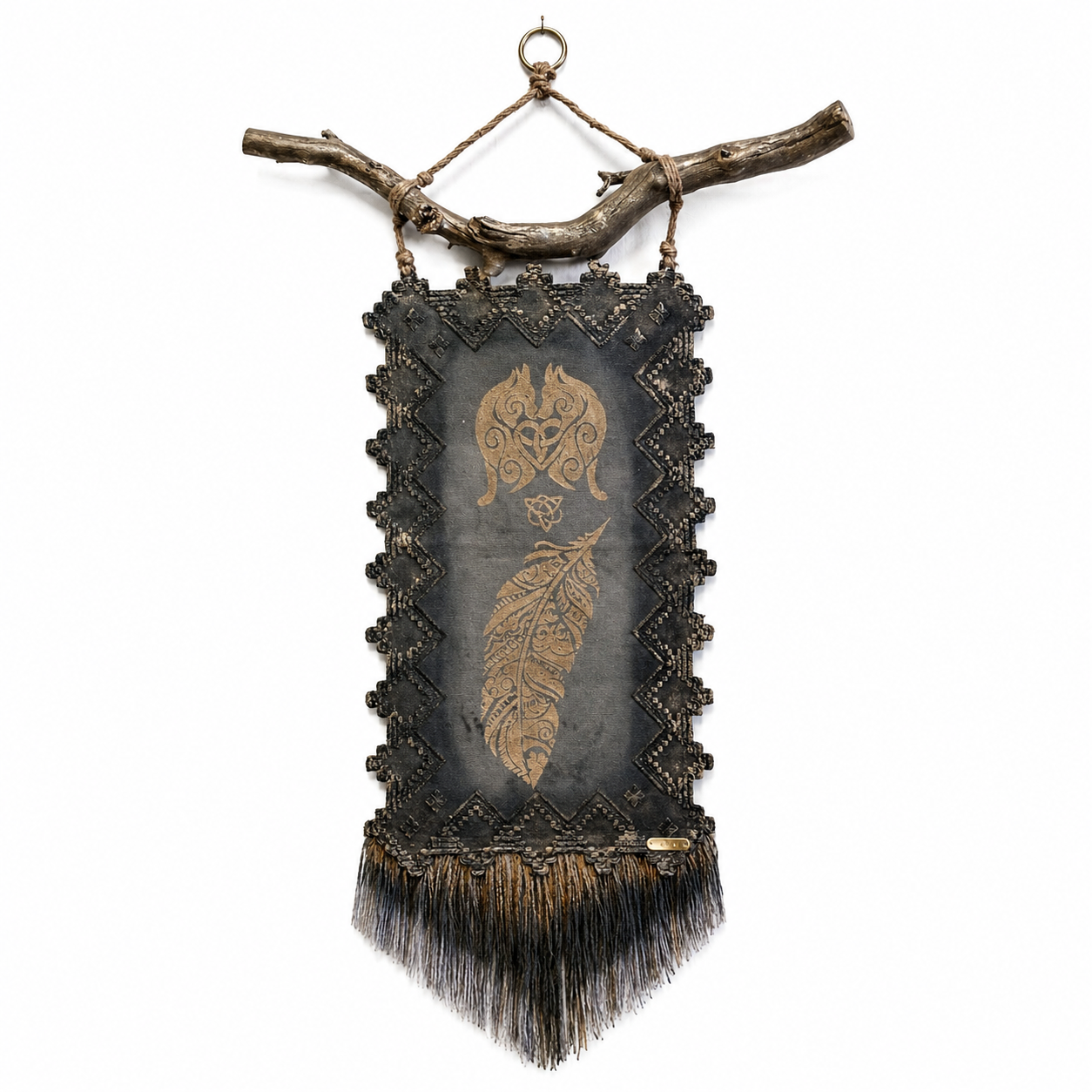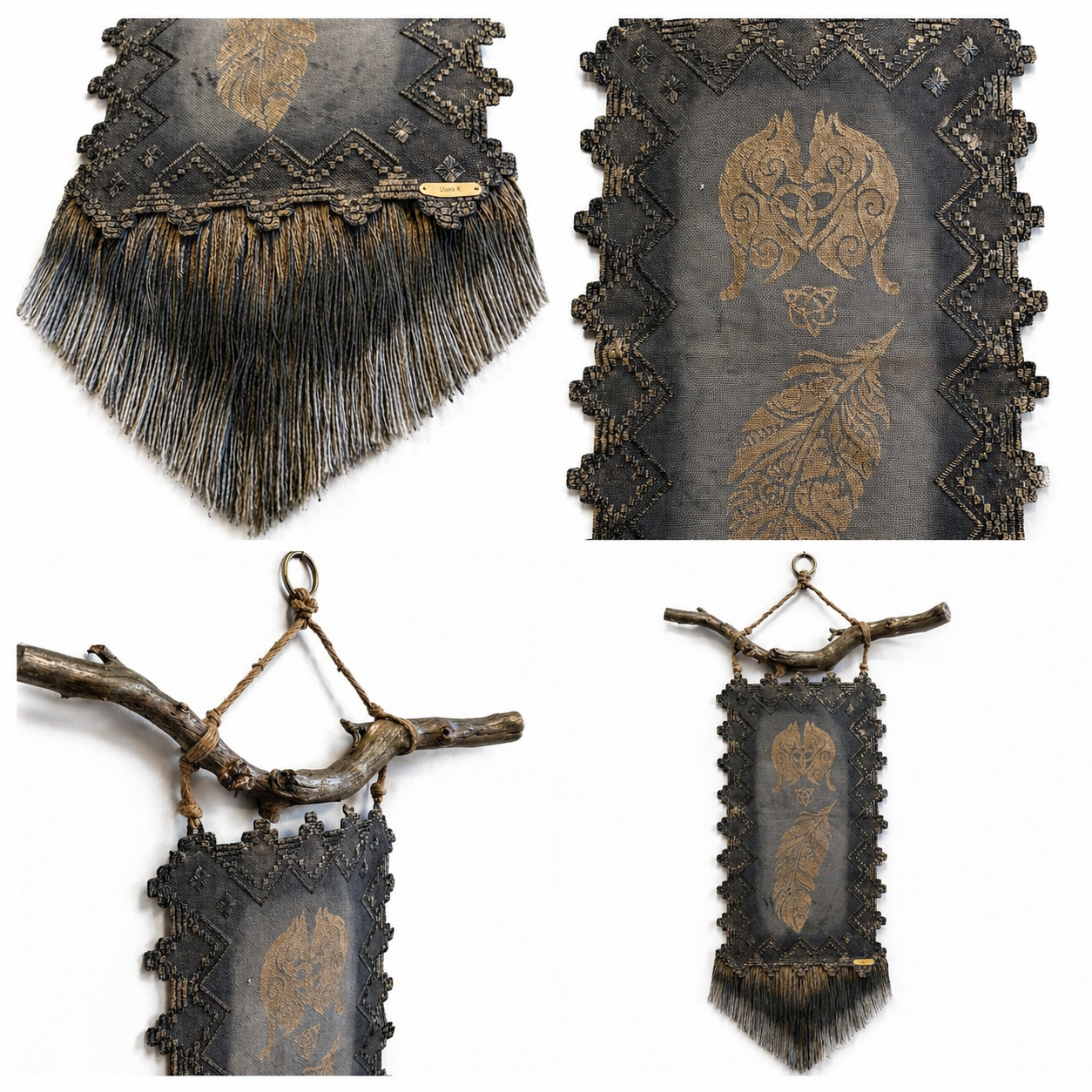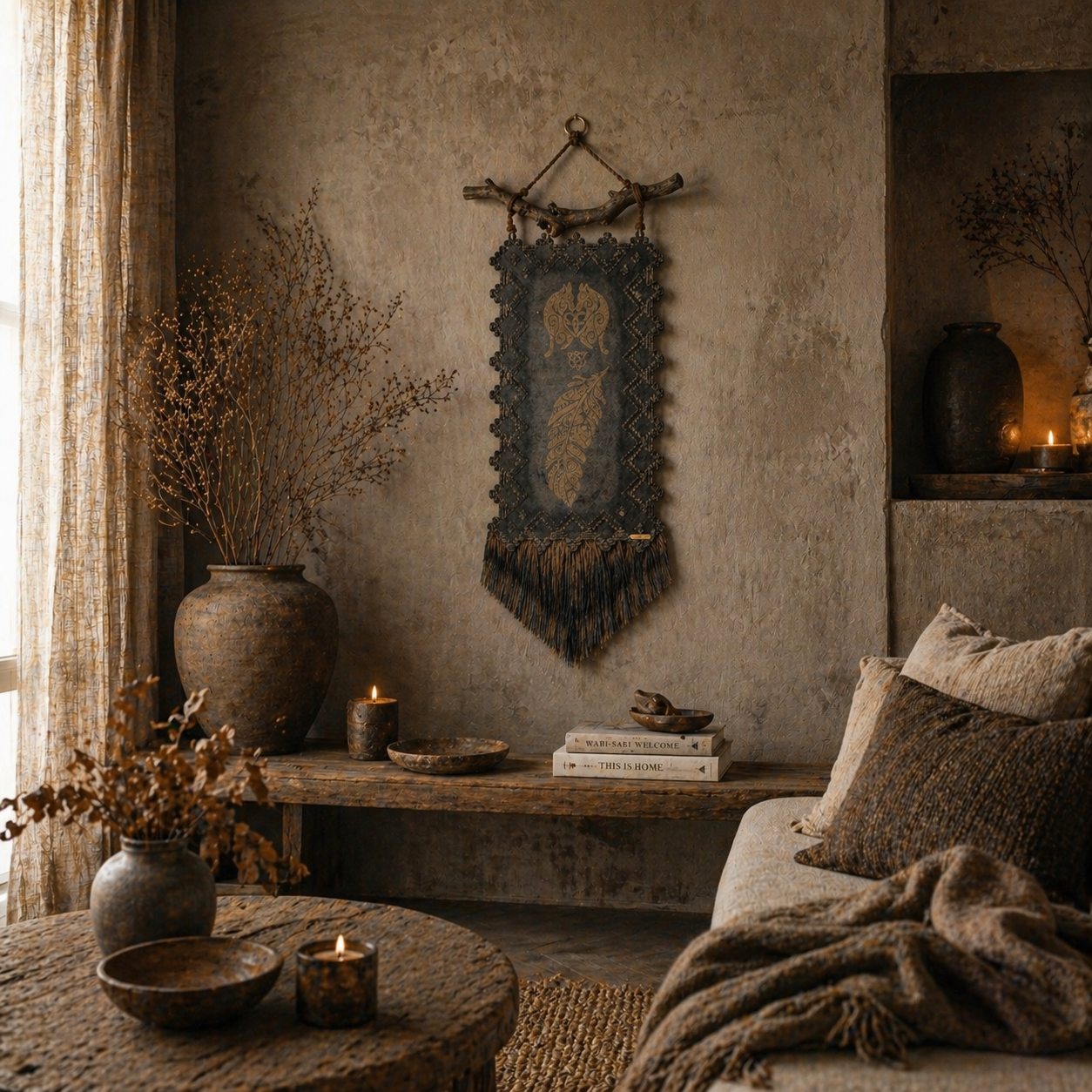 Usva K:n käsintehty seinävaate tuo tilaan syvyyttä ja luonnonläheistä rauhaa. Tumma sävy, koristeellinen kuviointi ja näyttävä hapsutus luovat vahvan mutta harmonisen ilmeen. Uniikki ripustus luonnonoksasta tekee jokaisesta kappaleesta yksilöllisen sisustuselementin.
