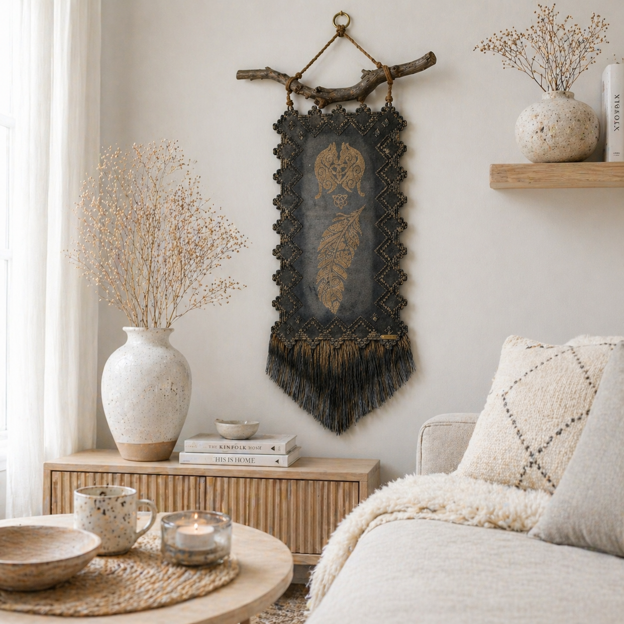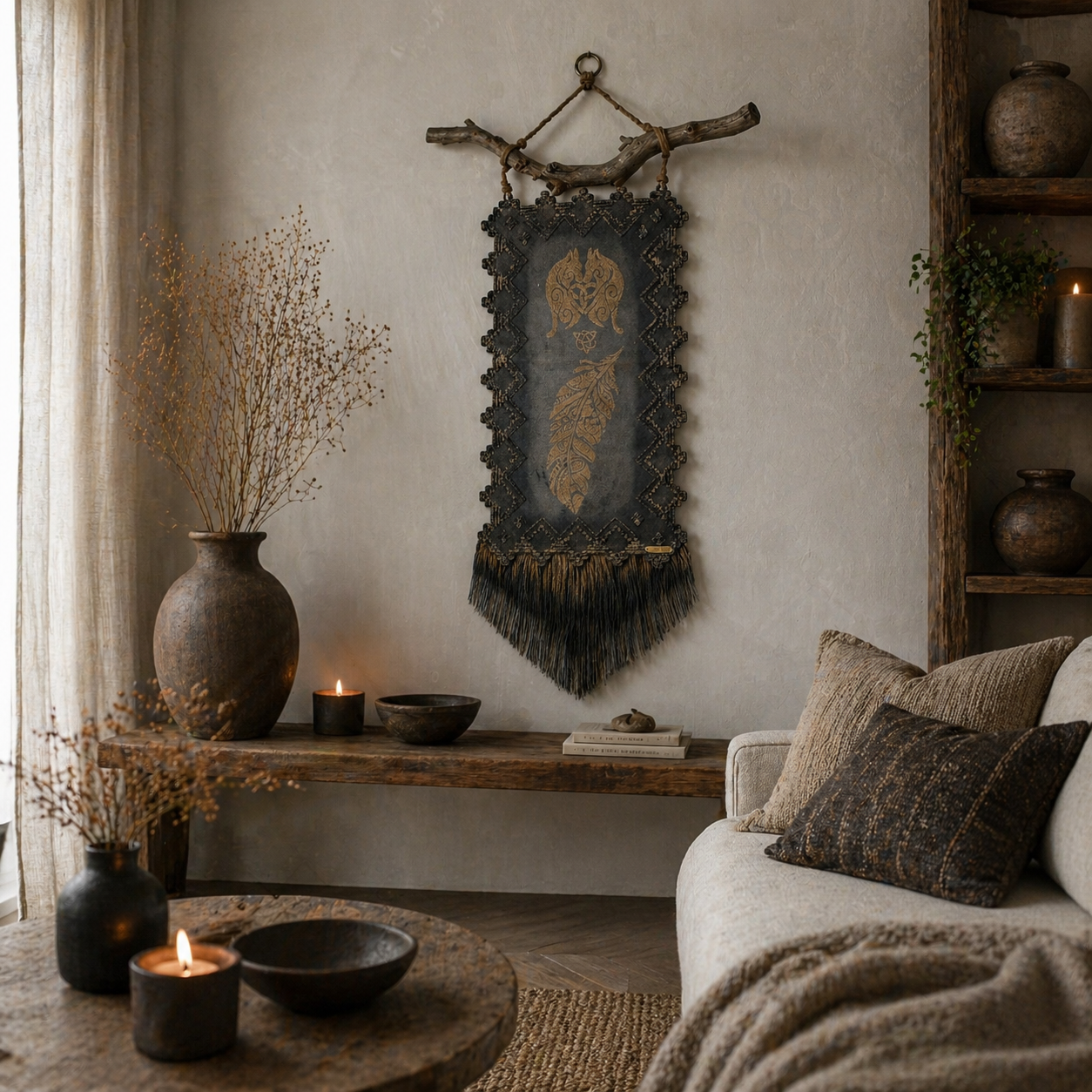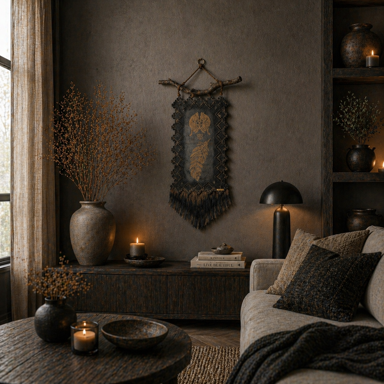 Usva K:n käsintehty seinävaate tuo tilaan syvyyttä ja luonnonläheistä rauhaa. Tumma sävy, koristeellinen kuviointi ja näyttävä hapsutus luovat vahvan mutta harmonisen ilmeen. Uniikki ripustus luonnonoksasta tekee jokaisesta kappaleesta yksilöllisen sisustuselementin.