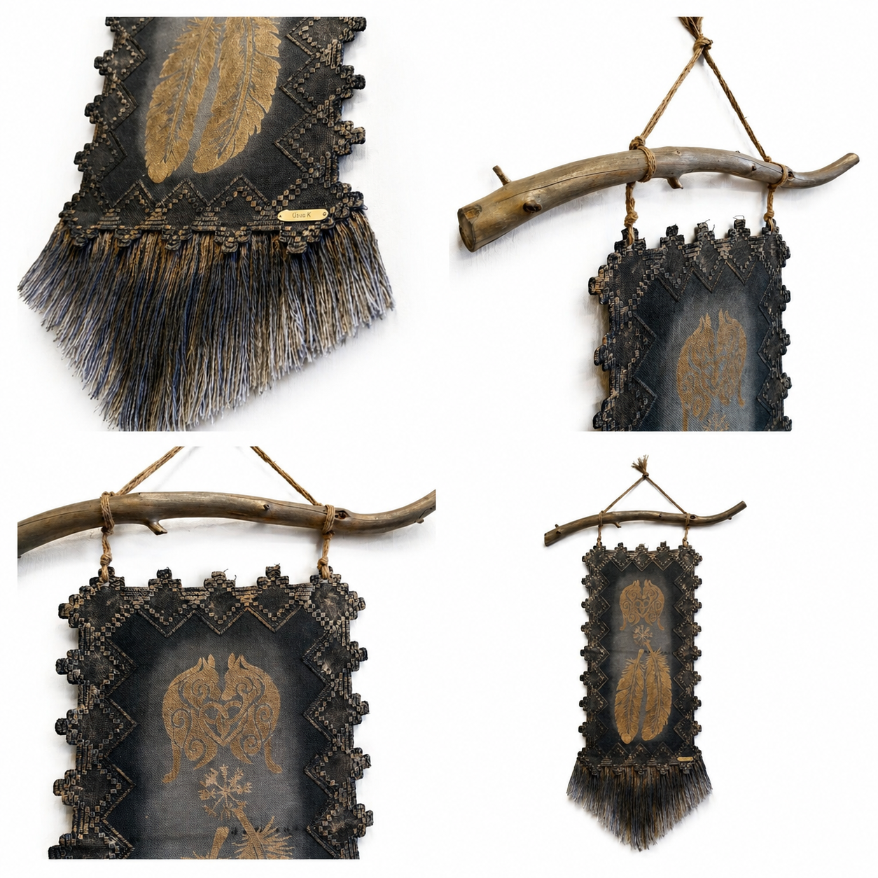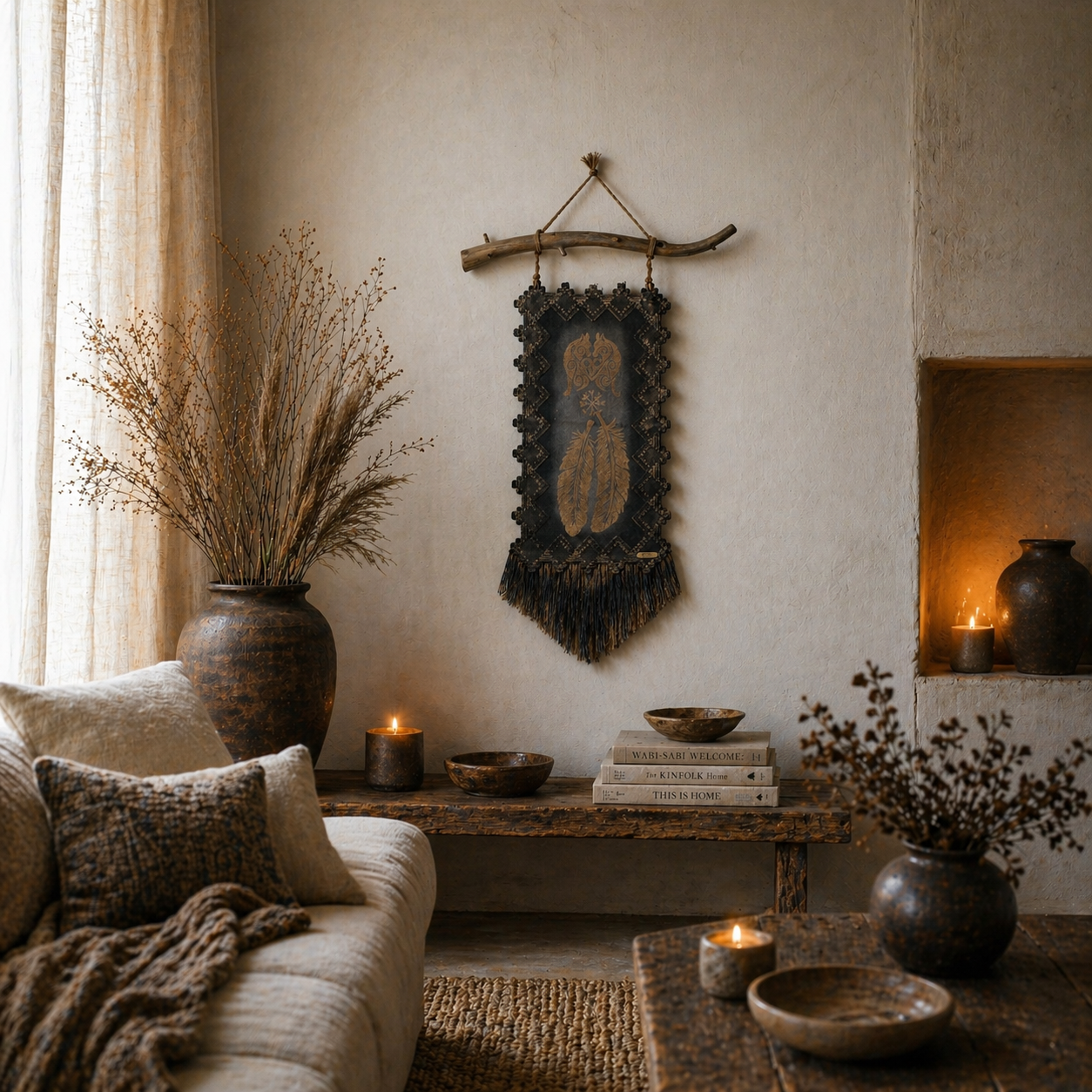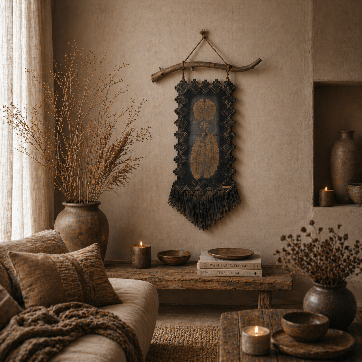 Usva K:n käsintehty seinävaate yhdistää luonnonoksan, syvät sävyt ja yksityiskohtaisen susi ja sulka aiheiset symboli kuvioinnin näyttäväksi kokonaisuudeksi. Pehmeä hapsutus ja maanläheinen ilme tuovat sisustukseen lämpöä ja rauhaa.