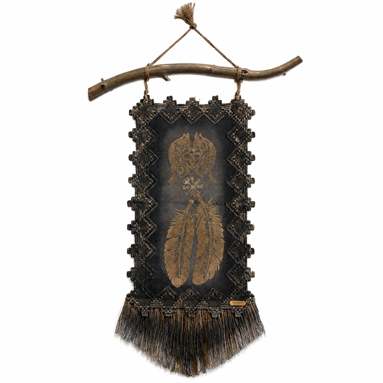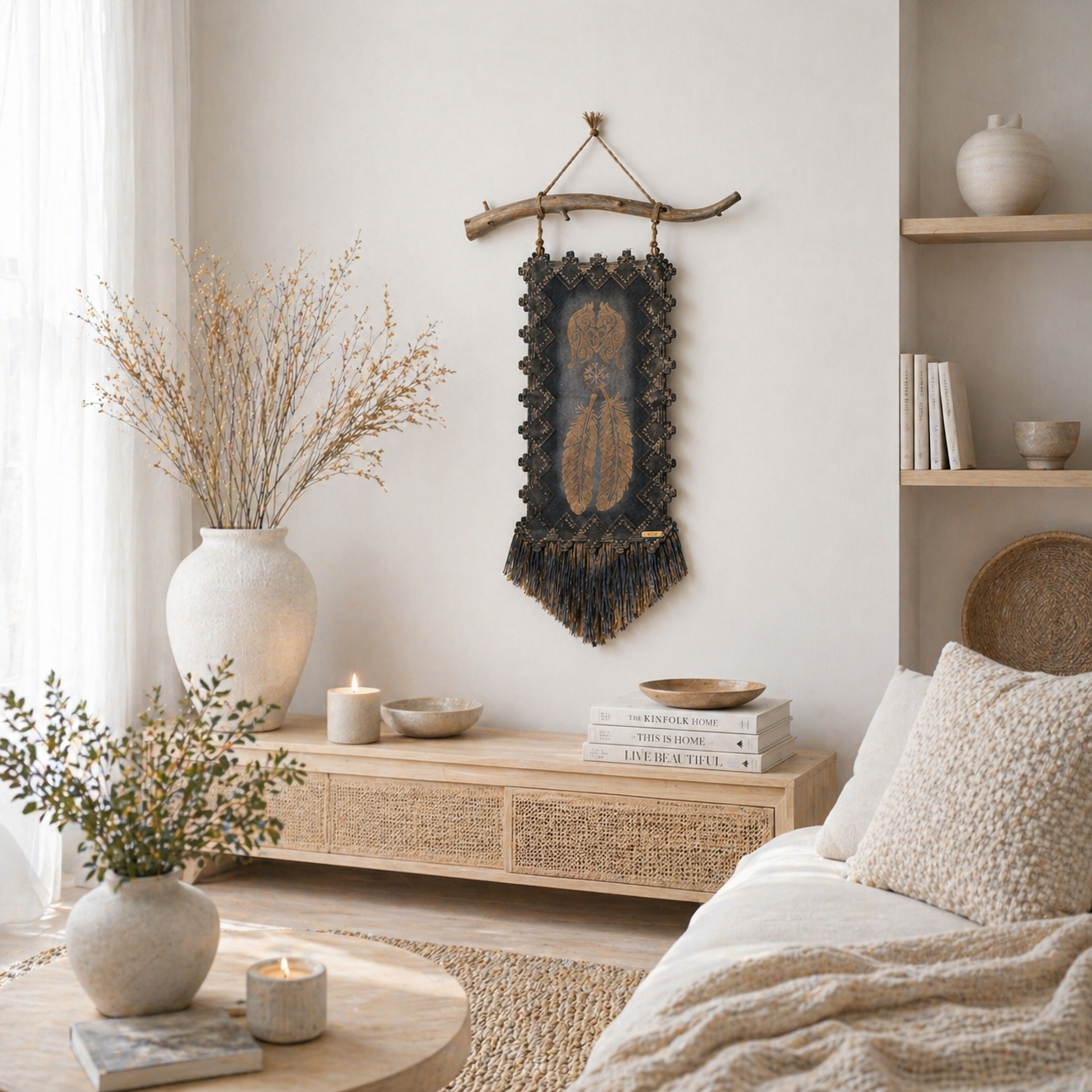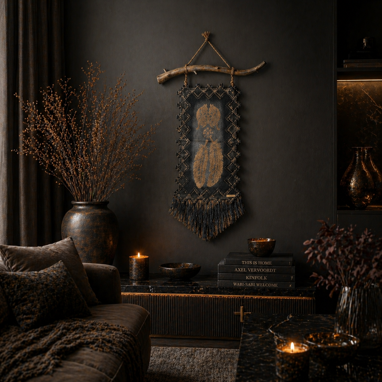 Usva K:n käsintehty seinävaate yhdistää luonnonoksan, syvät sävyt ja yksityiskohtaisen susi ja sulka aiheiset symboli kuvioinnin näyttäväksi kokonaisuudeksi. Pehmeä hapsutus ja maanläheinen ilme tuovat sisustukseen lämpöä ja rauhaa.
