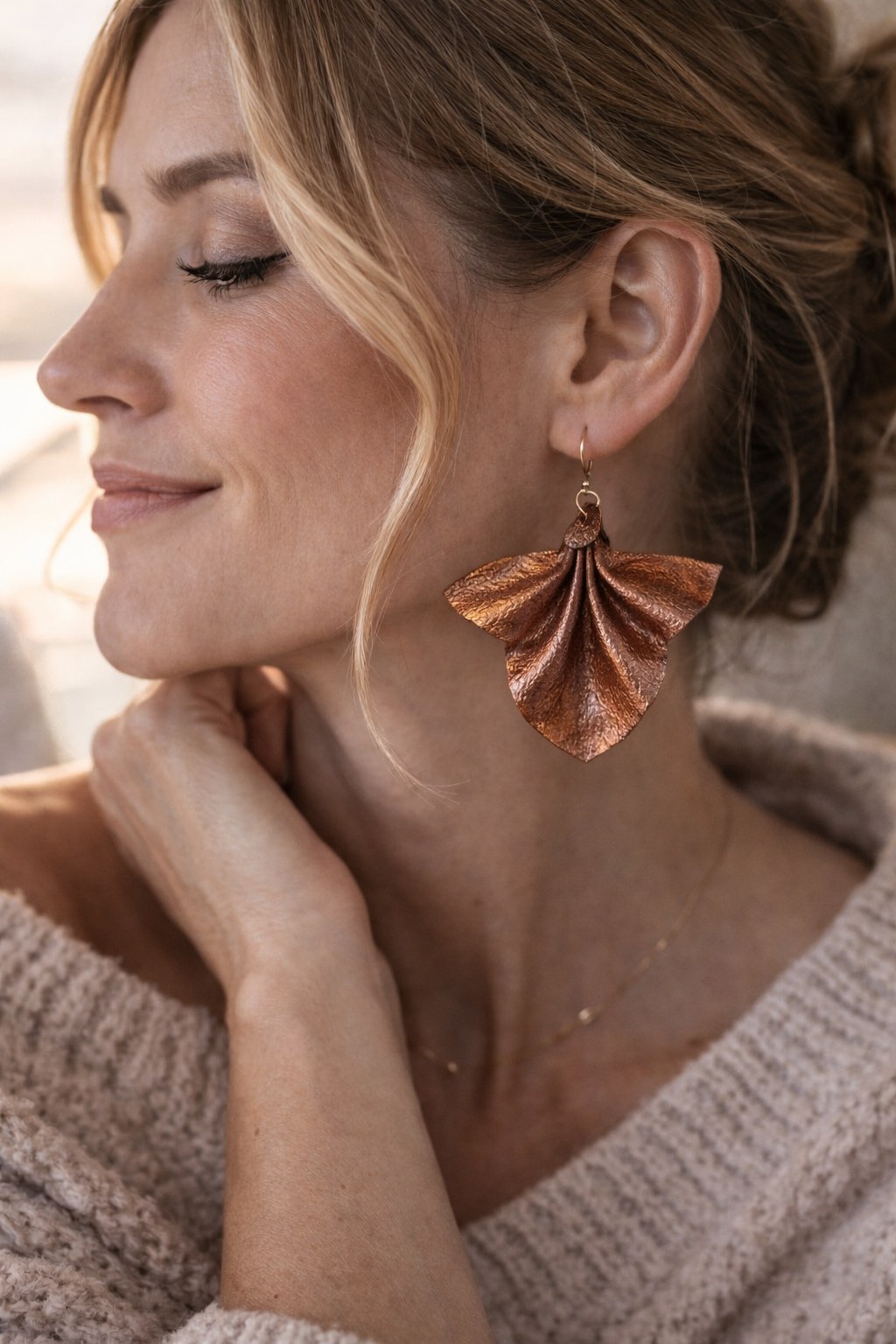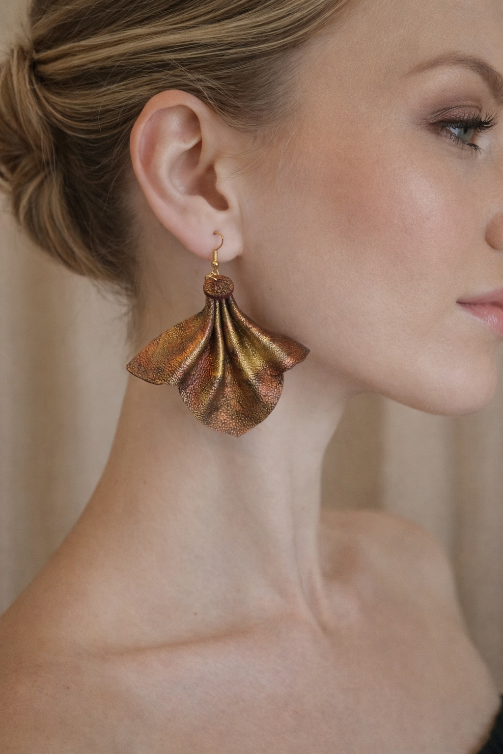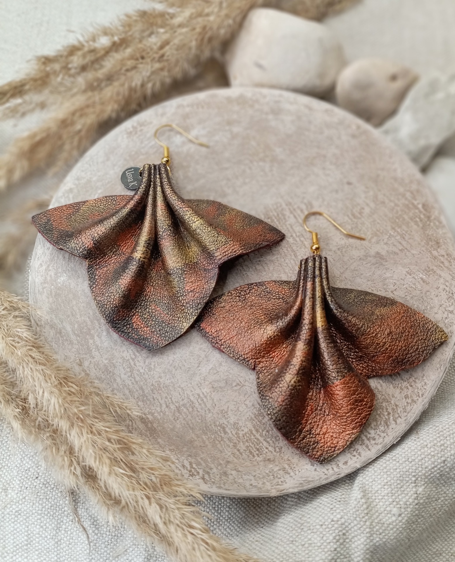 Vaahteranlehti korvakoru aitoa nahkaa. Pituus koukunkanssa 7cm. Kulta/kupari hohde väri, käsinmaalattu. Koukkuosa 18k kullattua kirurginterästä!