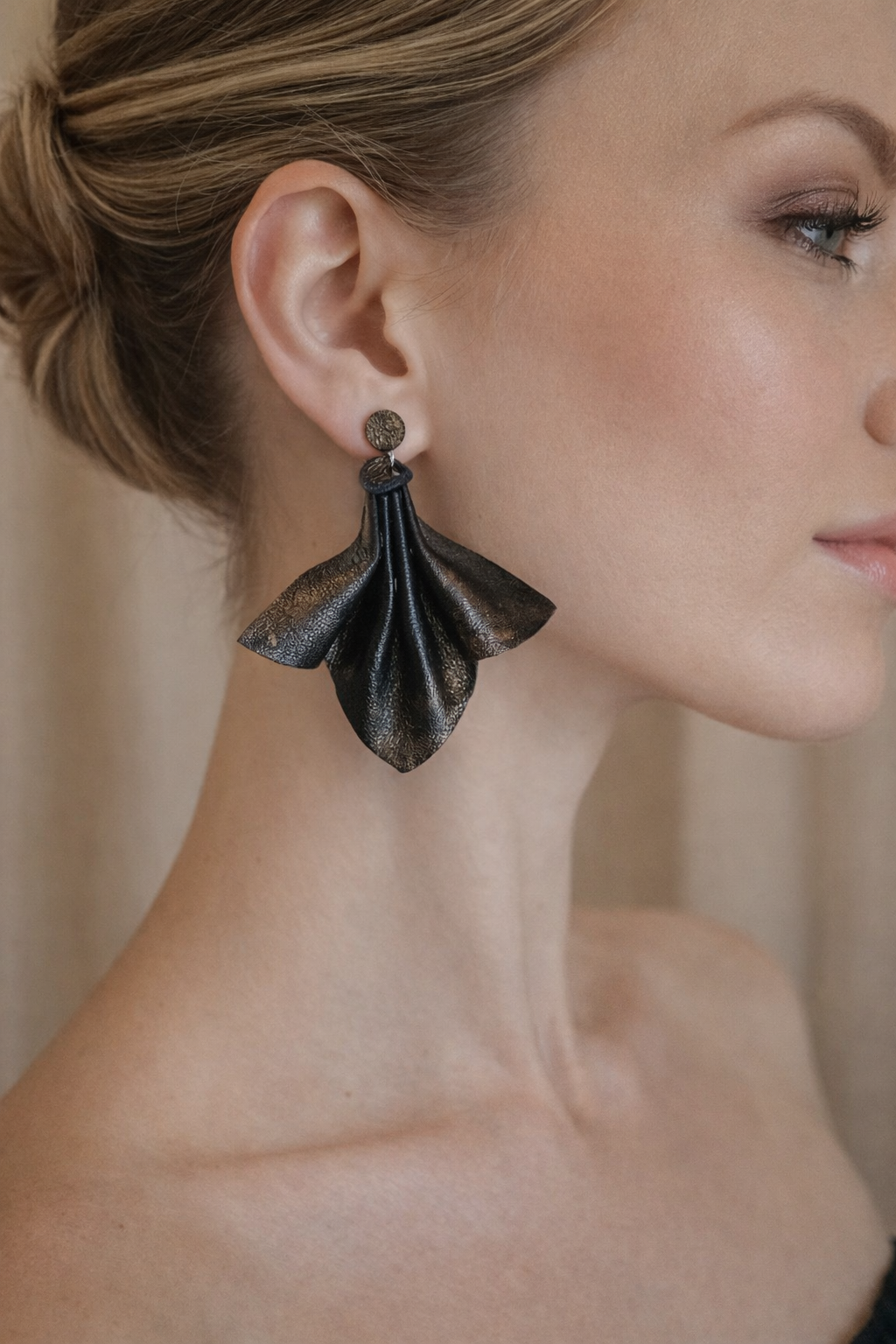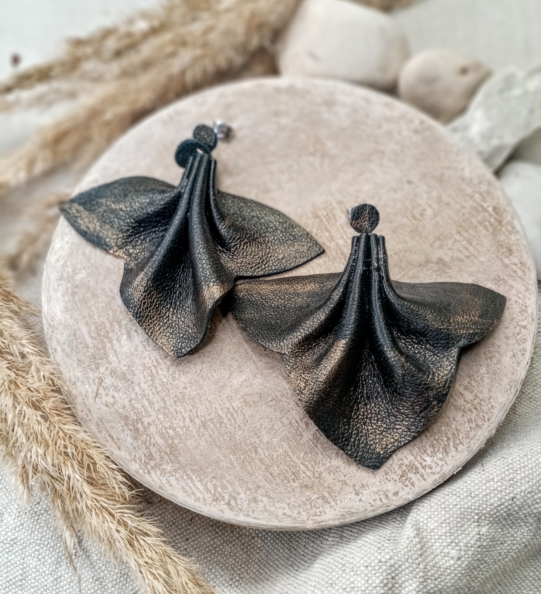 Vaahteranlehti korvakoru aitoa nahkaa! Pituus papin kanssa 7cm. Musta/pronssi käsinmaalattu. Korvapiikki kirurginterästä!